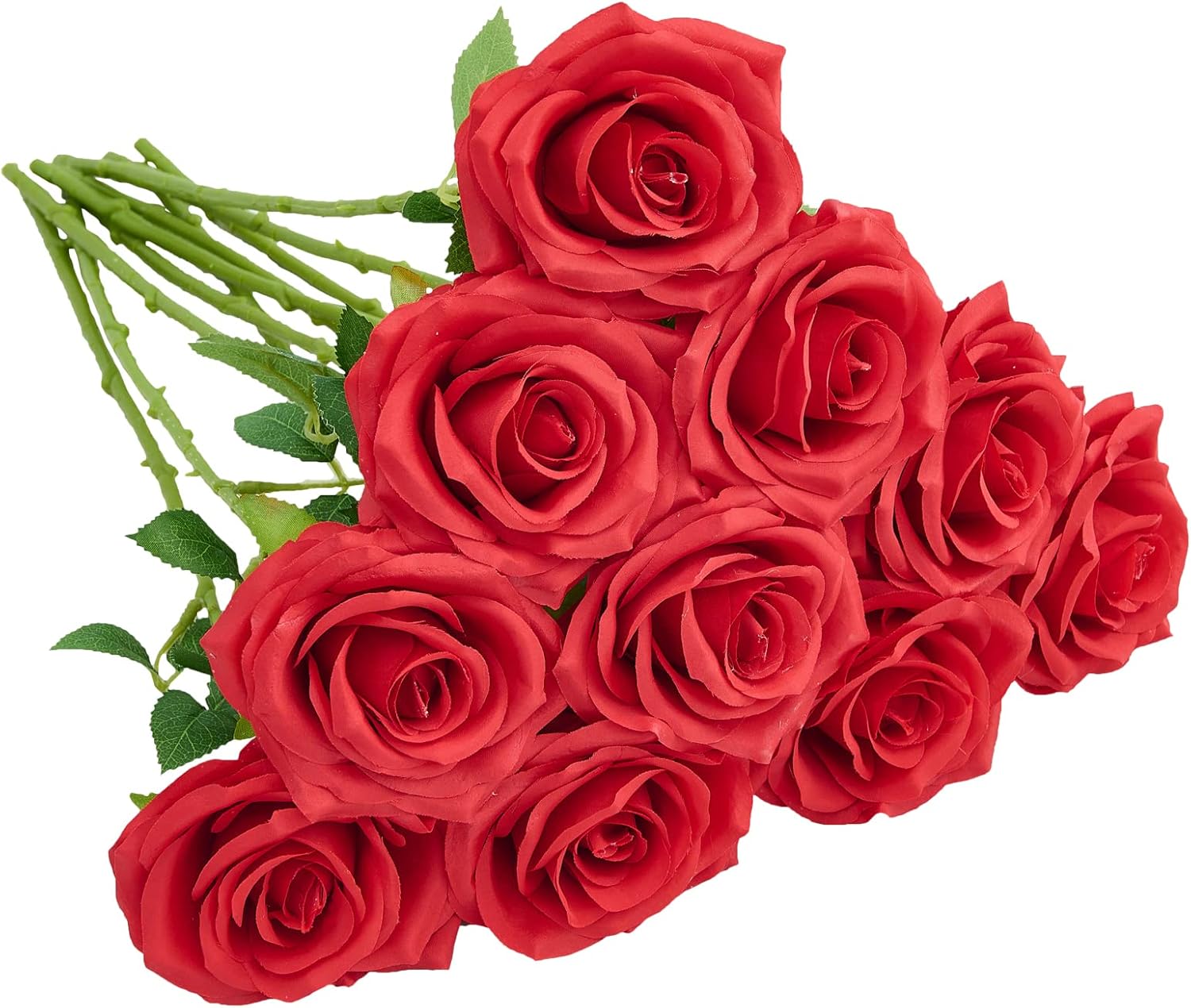 Artificial Rose 10pcs Red Silk Flower Faux Artificial Roses with Long Stems for Wedding Arrangement, Bridal Bouquet, Centerpiece, Fake Faux Silk Flowers