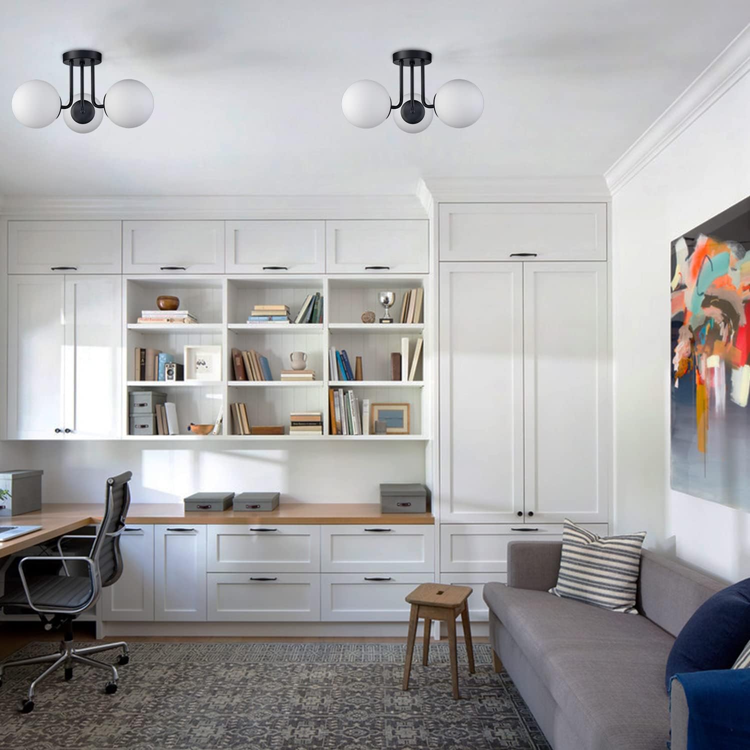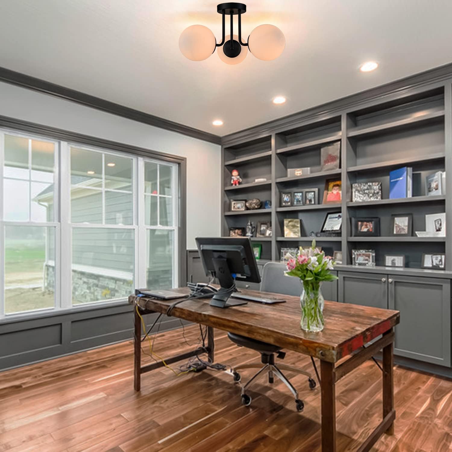 • 3-light matte black semi flush mount ceiling light made of high quality metal,which features 220-degree high-temperature baking varnish craft for strong adhesion.Crafted from globe opal manual blown glass shade,that offering more uniform and soft lighting without shadows.