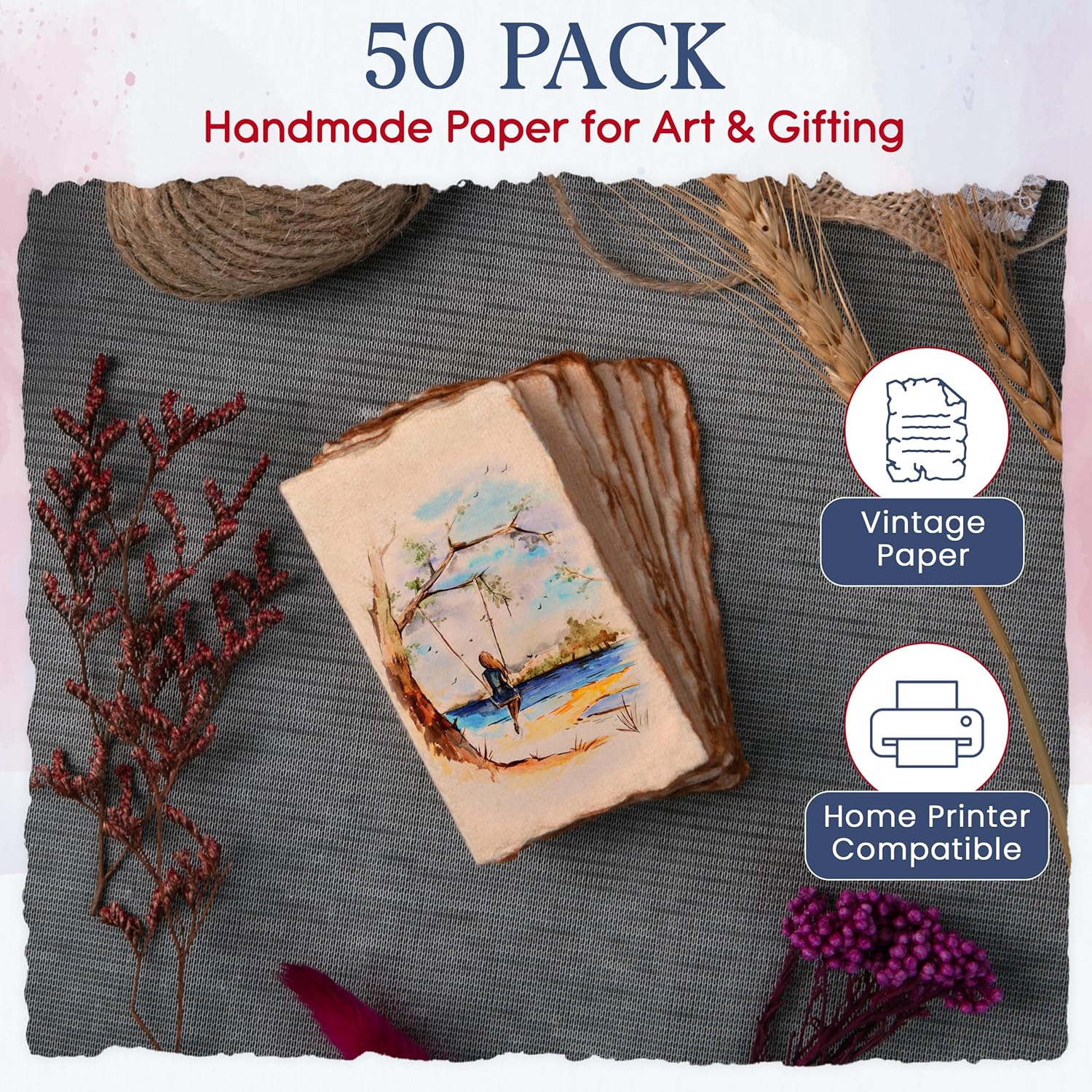 • [Artisan Crafted]: Experience the craftsmanship of our 50-pack handmade cotton deckle edge vintage paper, expertly produced by artisans using time-honored techniques since 14th-century India. This luxurious, sun-dried, cold-pressed 150gsm paper is externally treated with a plant-based sizing solution, making it ideal for writers, artists, and crafters—perfect for watercolor, acrylics, ink, charcoal, colored pencils, mixed media, bespoke stationery, and wedding invitations. Business card size