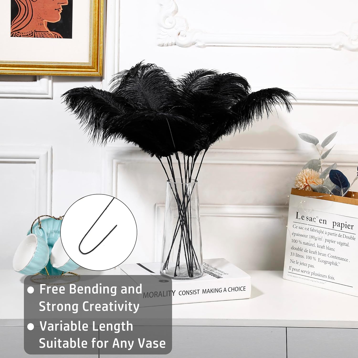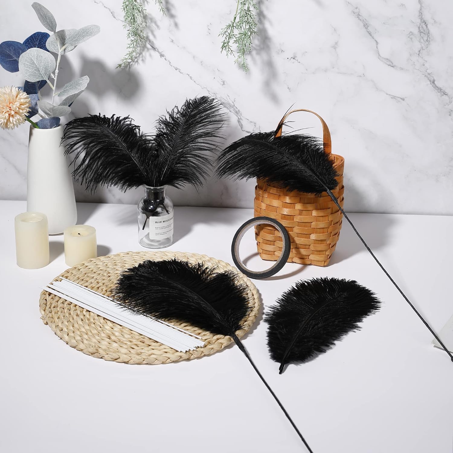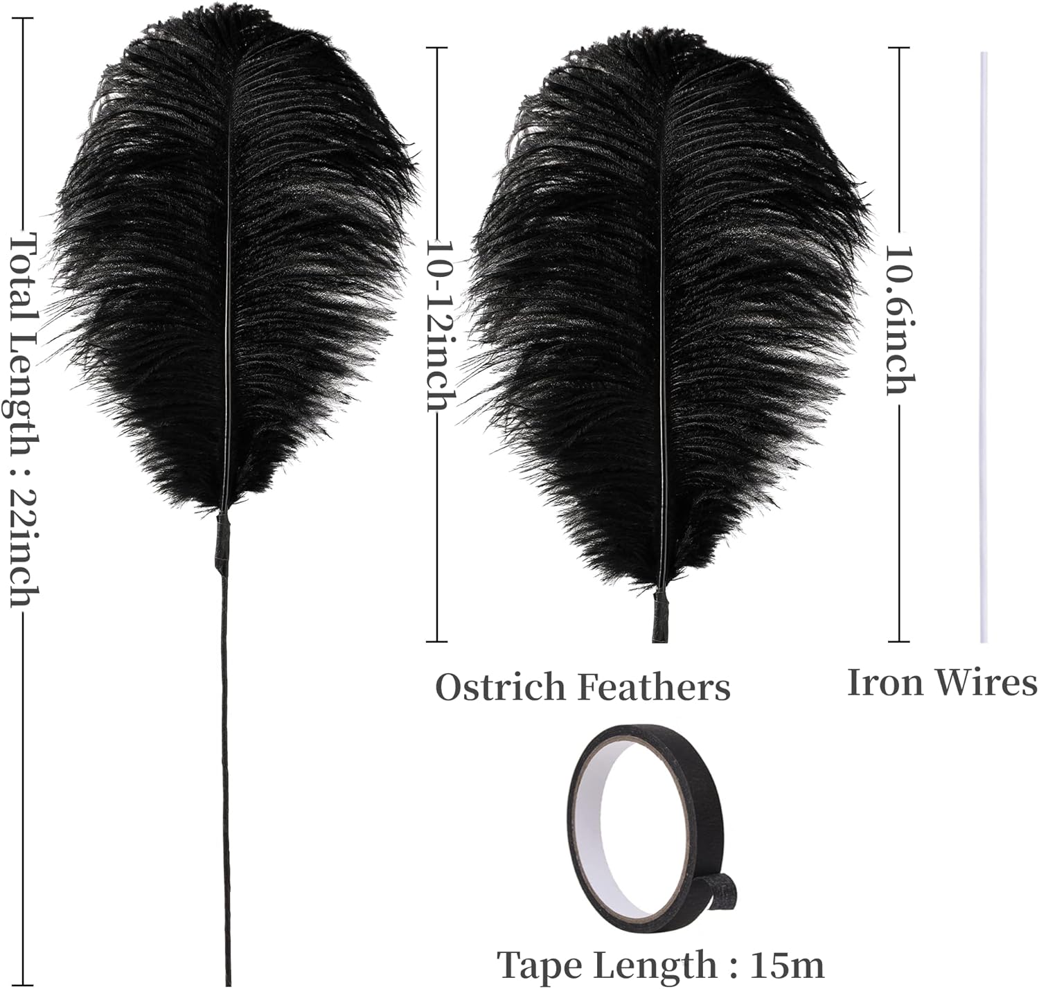 • 22inch Ostrich Feathrs Kit: 20pcs 10-12 inches black ostrich feathers, 20 pcs 10 inches long iron wire, and a 15m tape in the same color with the feather. Rich set content to meet your decoration and use needs