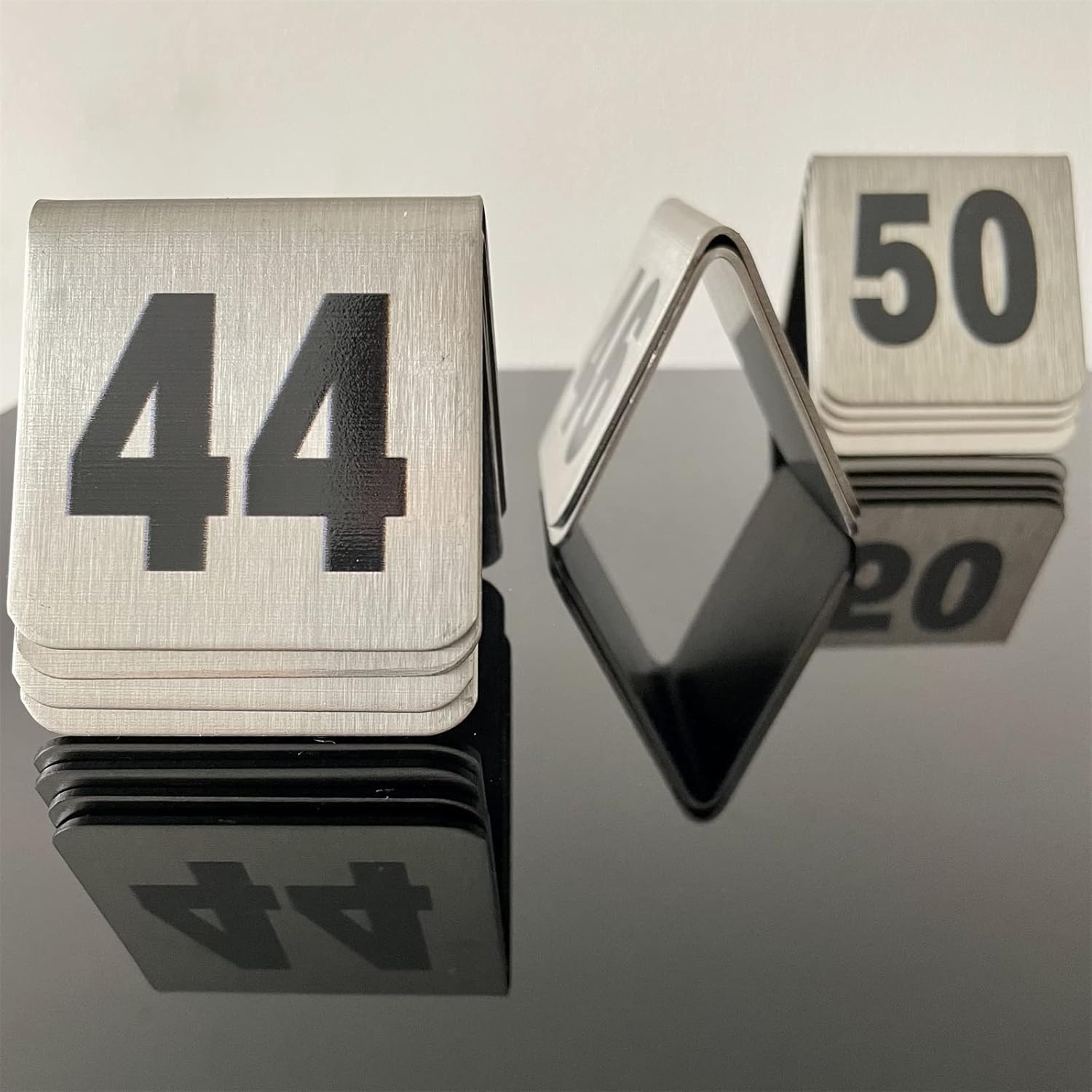 • The tent-style design makes the place cards more stable, easy storage.The double-sided numbers are easy to find, and the stainless steel material is hard to damage,never rust.Maintenance is simple, wash with water or wipe with cloth.