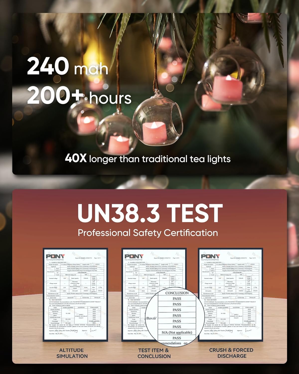 • RELIABLE & SECURE: Homemory LED tea lights are tested rigorously, ensuring their reliability. With (UN38.8) internationally certified batteries and healthy polypropylene materials, plus a secure battery cap design, we care about your safety