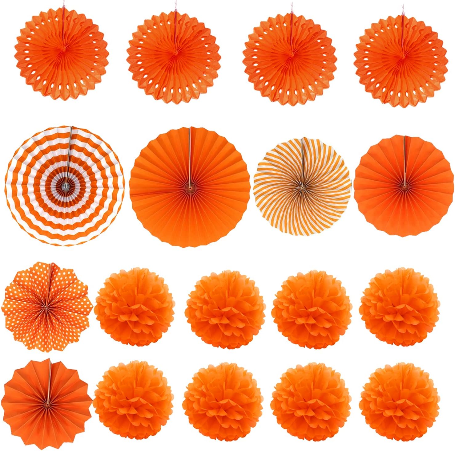 • Includes: 1 x 6.5ft Triangular pennants, 8 x 10inch/25cm Paper pompoms, 6 x 10inch/25cm Paper fans, 4 x Paper hollow fans, 2 x 6.5ft Circle Paper Garland. ( Color: Orange and White)