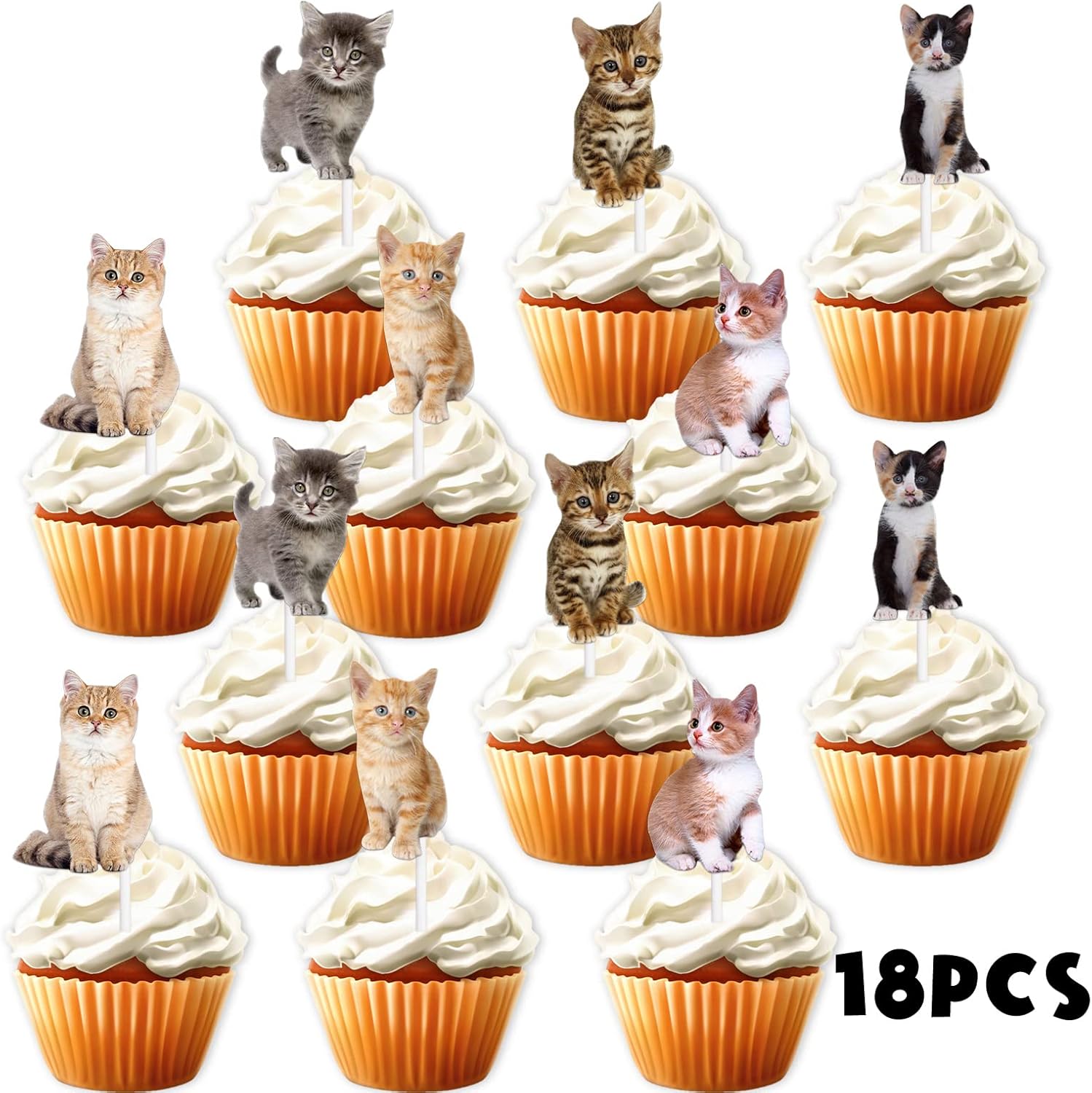 18pcs Glitter Cat Dessert Cupcake Topper Pick for Cute Lovely Cat Theme Decorations Baby Shower Boys Girls Happy Birthday Party Decor Supplies