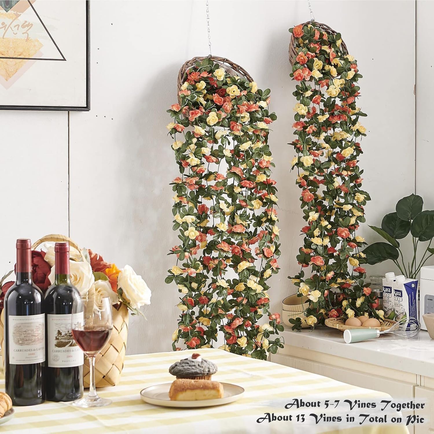 • Package: 6 vine plant hanging fake flower garland, 3 bags in total. 8.2FT (250CM) per vine, each plant with 45 flowers. 1.5"(3.8CM) in diameter of rose heads. 45 leaves per vine. When you connect these 6 vines end-to-end, the total length can reach 66ft. The single vine is not thick, but when you wrap 6 pcs rose vines side by side together, you will get an 8.2 ft bigger flower vine, which is puffy & thick enough to decorate your room. We used multiple vines wrapped side by side in our picture