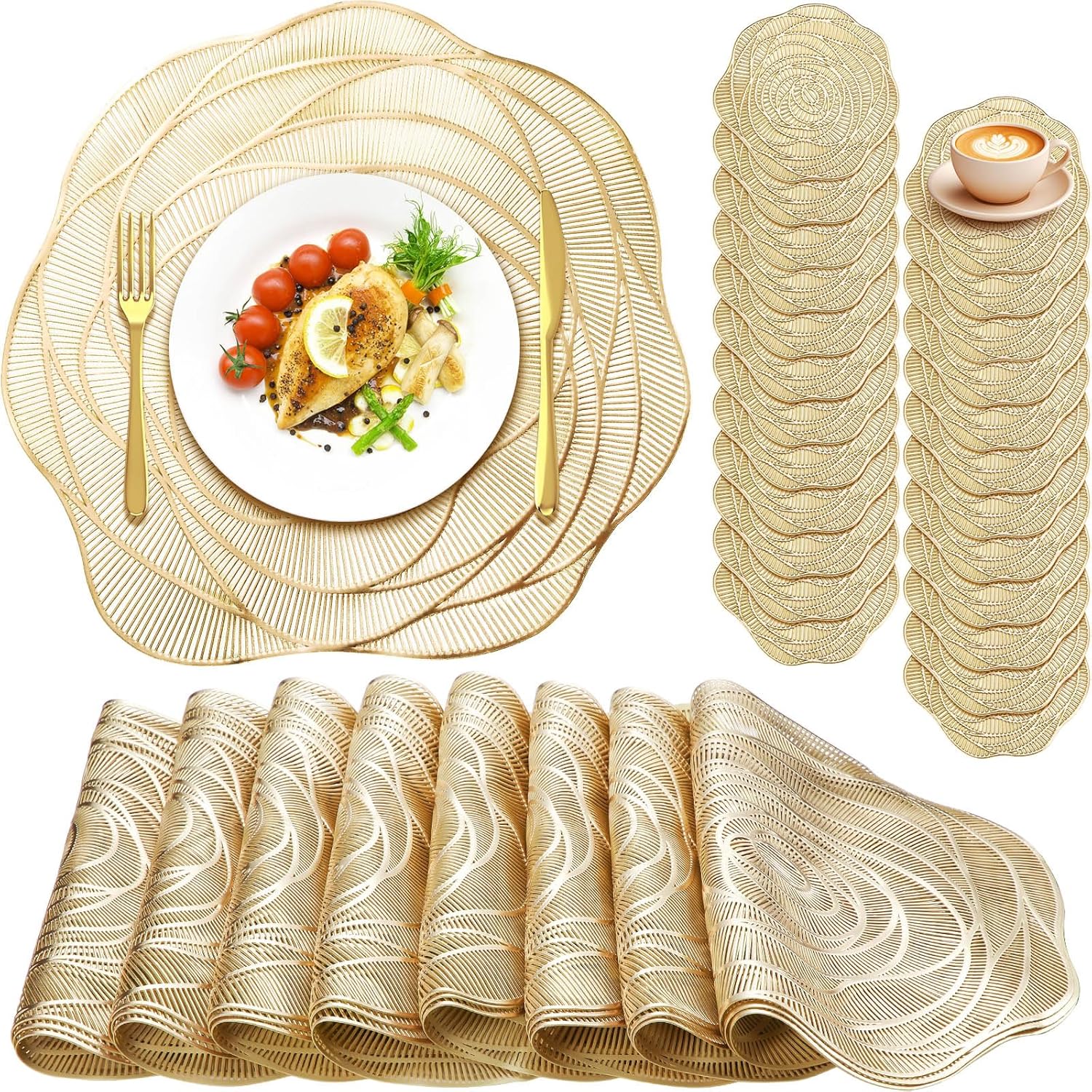 Sieral 24 Set 15 Inch Round Pressed Vinyl Placemats Hollow Out Rose Placemat Set Metallic Slip Resistant Place Mat Coaster Including Place Mats and Coasters for Wedding Dining Kitchen (Gold)