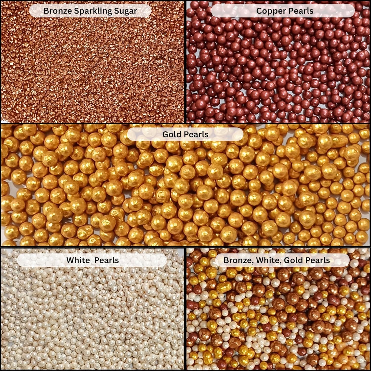 • Elegant Gatsby-Inspired Sprinkle Mix – Features a luxurious blend of gold, bronze, and white edible pearls with copper sparkling sugar, perfect for upscale events and stylish desserts.