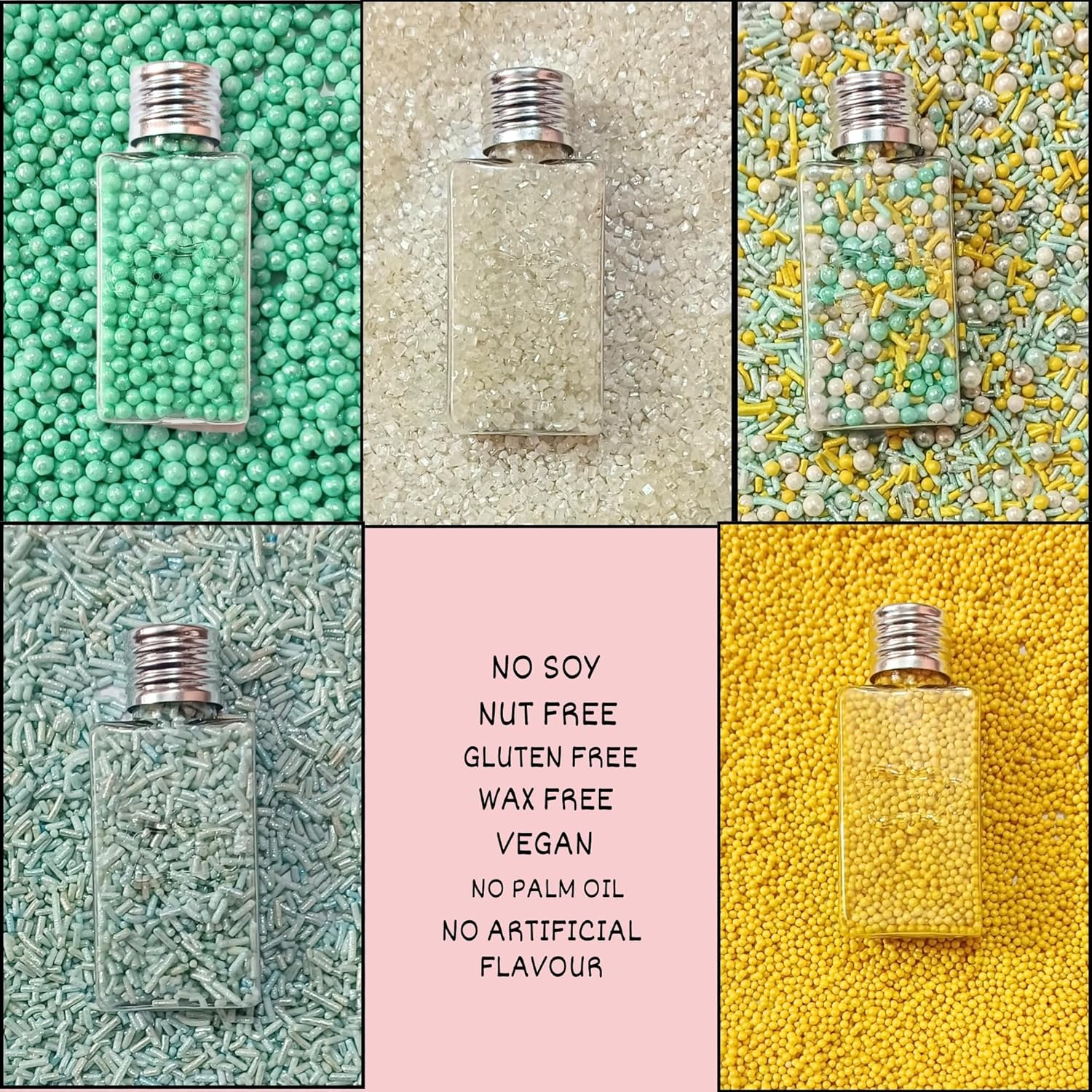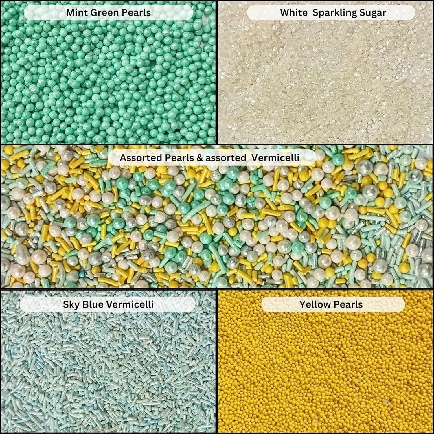 • Assorted Sprinkle Mix Pack (5 Varieties): Includes sky blue, yellow & white pearl dragees, jimmies, and sparkling sugar – perfect for creative dessert decorating.