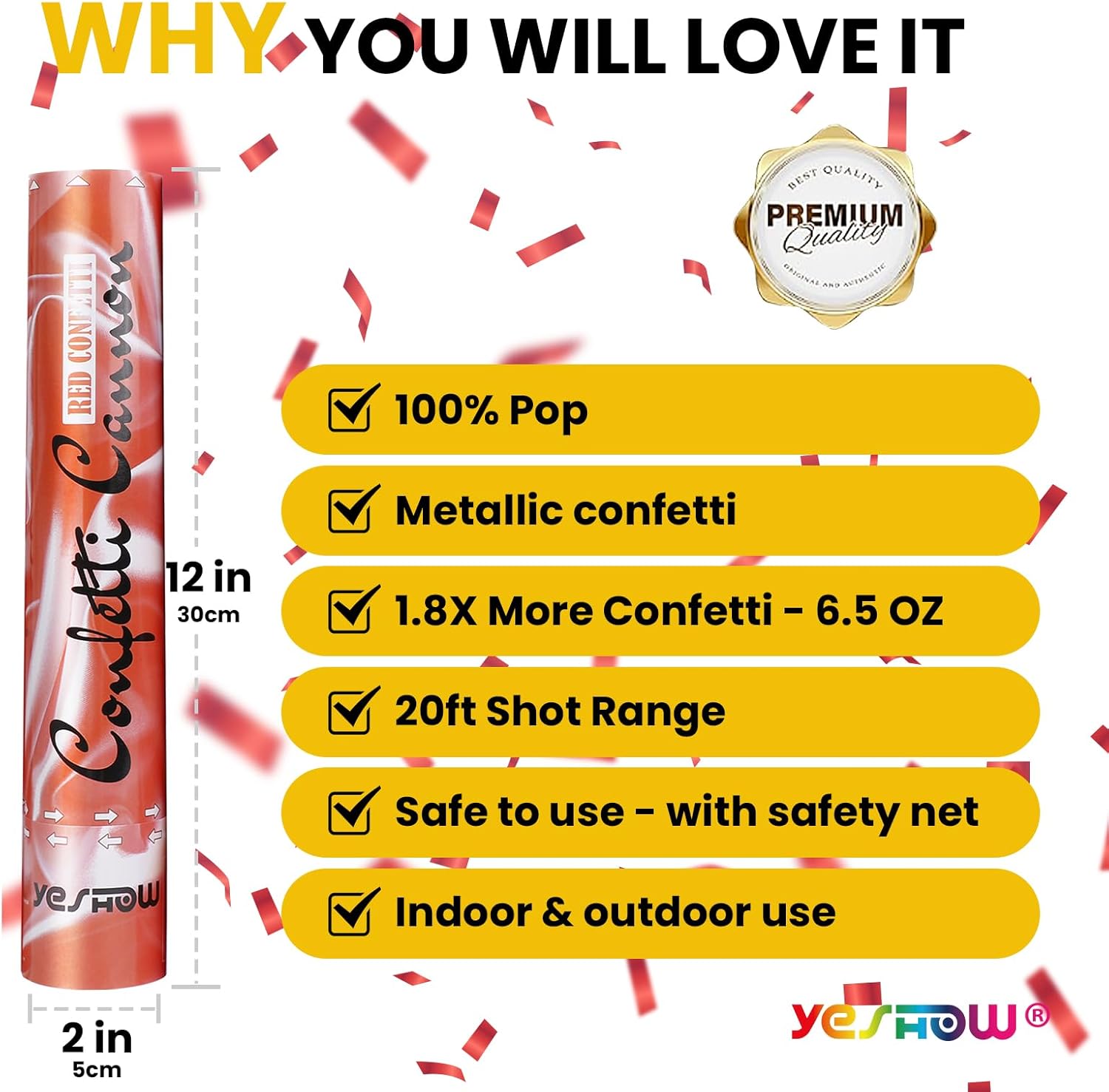 • 【SUPERIOR SAFETY】There would be nothing except red confetti out as shooting. Because there's safety net inside to prevent the metallic parts fly out. Safer to use both indoor and outdoor events