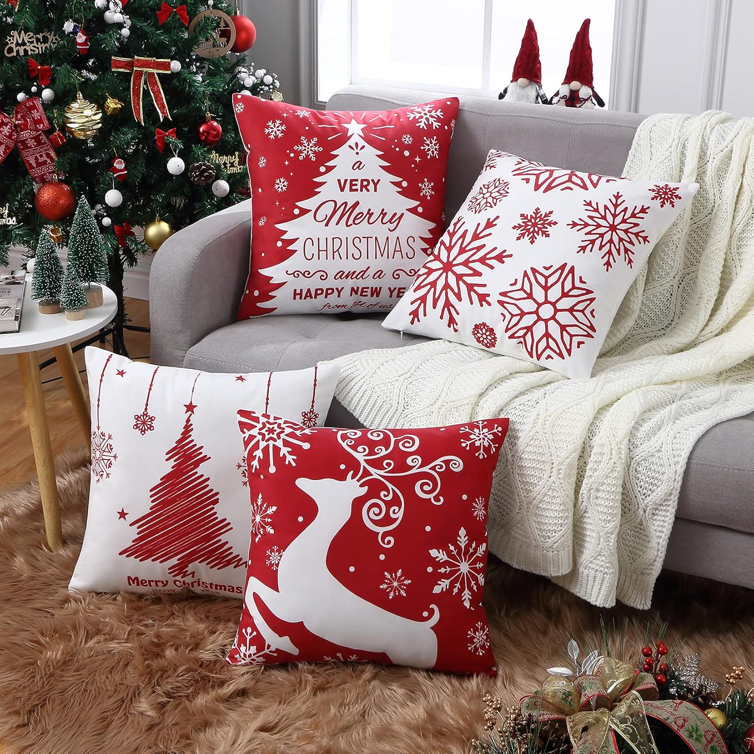 • ๐ŸŽ„{Great Christmas Decor} With the holiday season just around the corner, giving your home that lovely Christmassy look with our christmas cushion covers 20x20 will get lots of compliments from your guests. These printed patterns, including a Christmas Tree, Elk, and โ€œMerry Christmasโ€ letters, are specially designed for holiday parties and everyday entertainments. These red and white christmas pillow covers will effortlessly enhance your holiday decorations and create a festive atmosphere.
