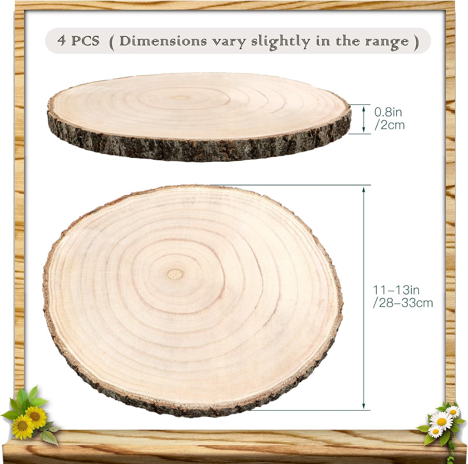 • Package Contents: You will receive 4 large round wood slices, measuring approximately 11-13inches. The size will vary slightly as they are made from natural trees