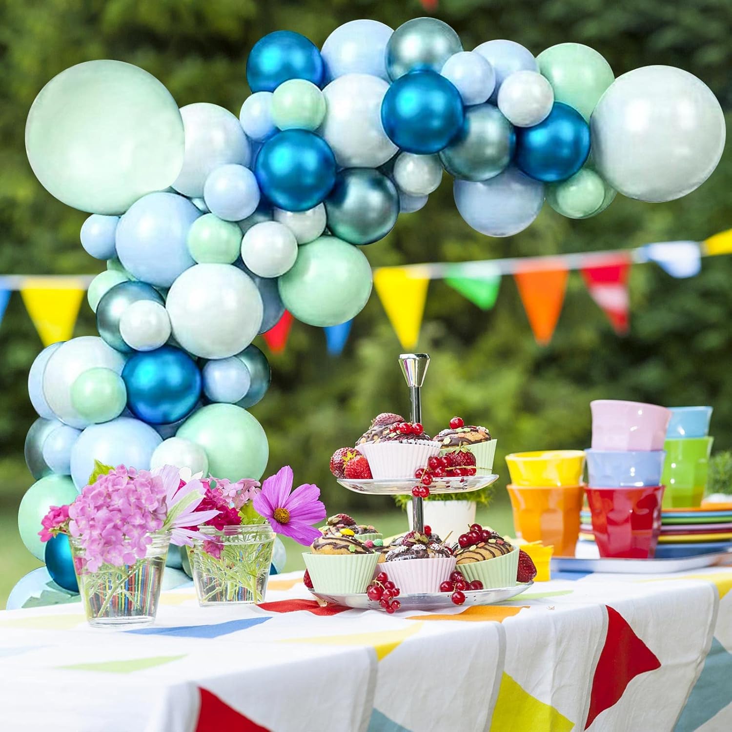 125pcs Blue Green Macaron Balloon and Metallic Blue Silver Balloon Garland Kit for Birthday Retirement Bridal Baby Shower Graduation Wedding Anniversary Party Decoration