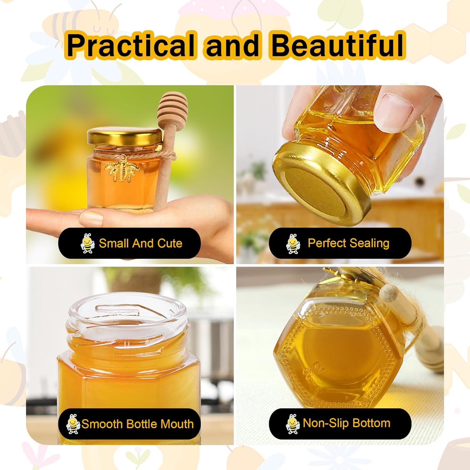• Leak-Proof Mini Jars of Honey: Like a hive guarding its treasure, the small honey jars bulk have airtight lids to lock in freshness and prevent leaks. Ideal for honey, jams, sauces, or treats, our mini honey jars with dippers keep sweetness sealed inside.