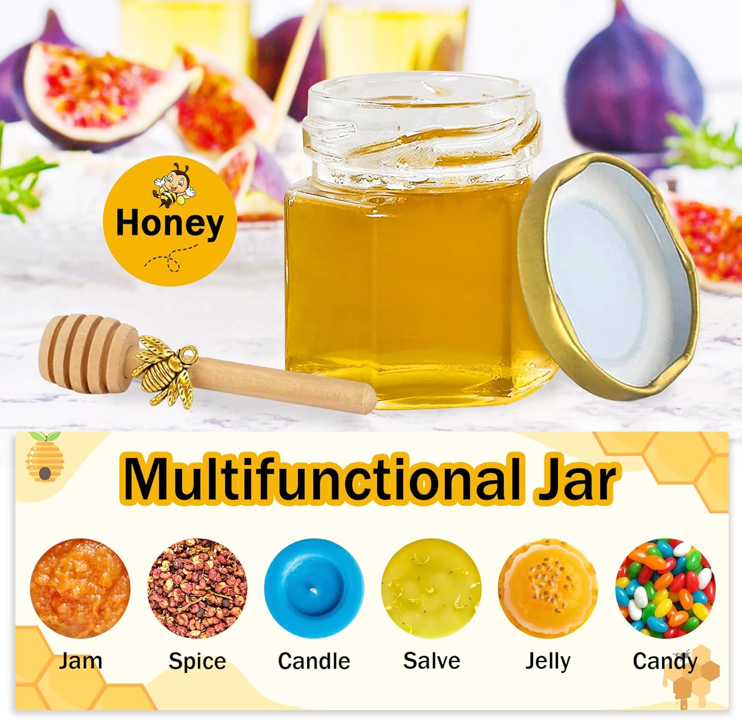 • Cute Hexagon Honey Jars with Lids: These 1.5 oz glass honey jars with lids feature a clear, rounded design that blends charm and elegance. Perfect for weddings, gift baskets, or crafts, they add a sweet, refined touch to every occasion.