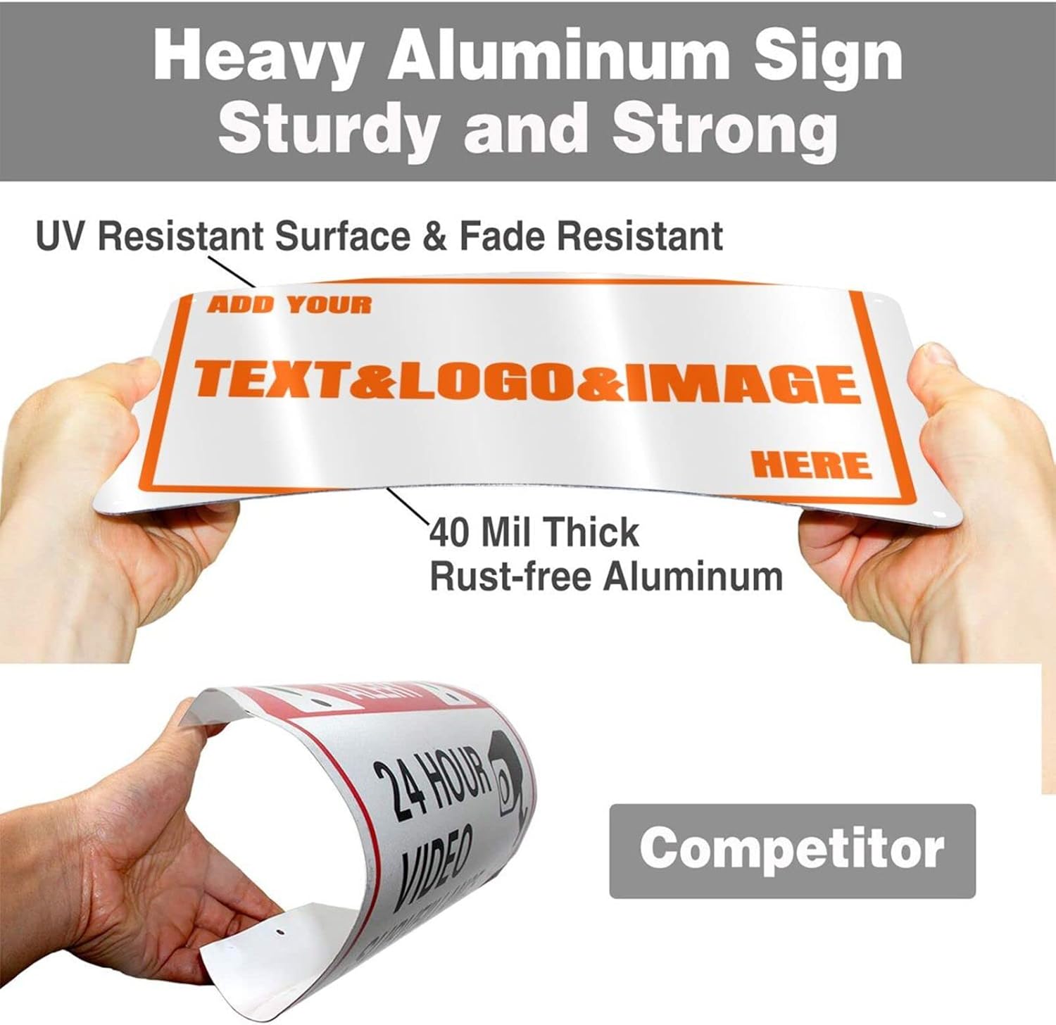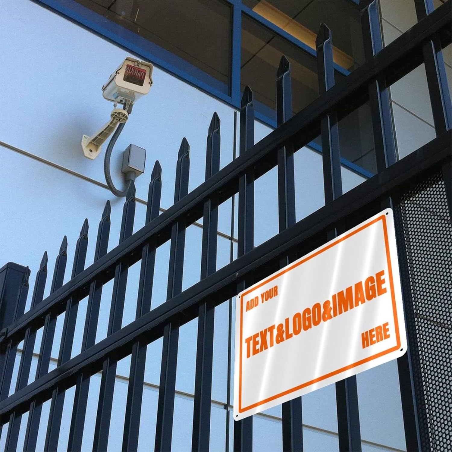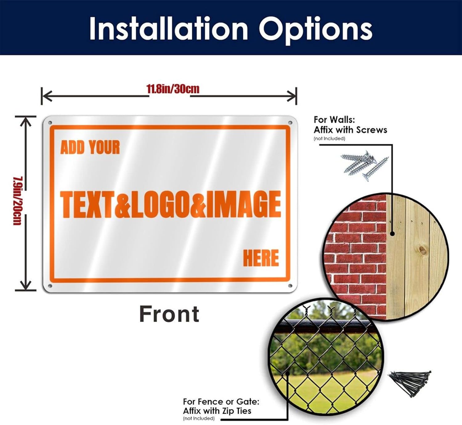 • 12 x 8 inch aluminum custom metal sign with 4 pre-drilled holes on the side that can be easily attached to any surface such as walls, doors or fences with cable ties or screws.