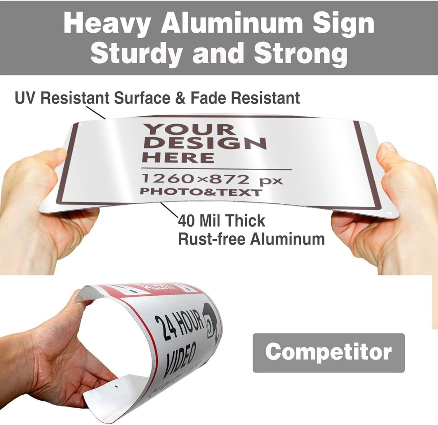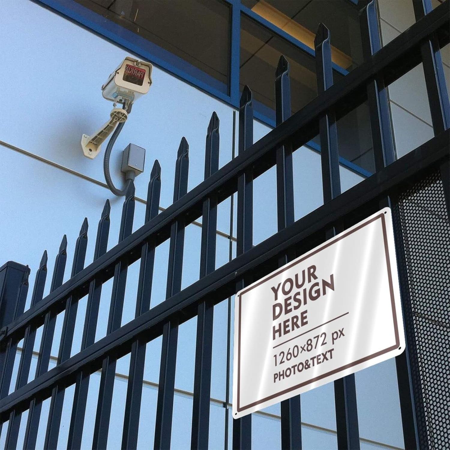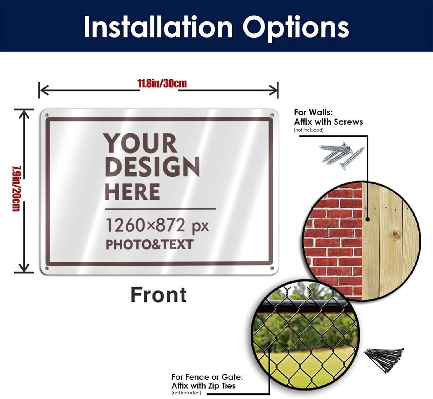 • 12 x 8 inch aluminum custom metal sign with 4 pre-drilled holes on the side that can be easily attached to any surface such as walls, doors or fences with cable ties or screws.