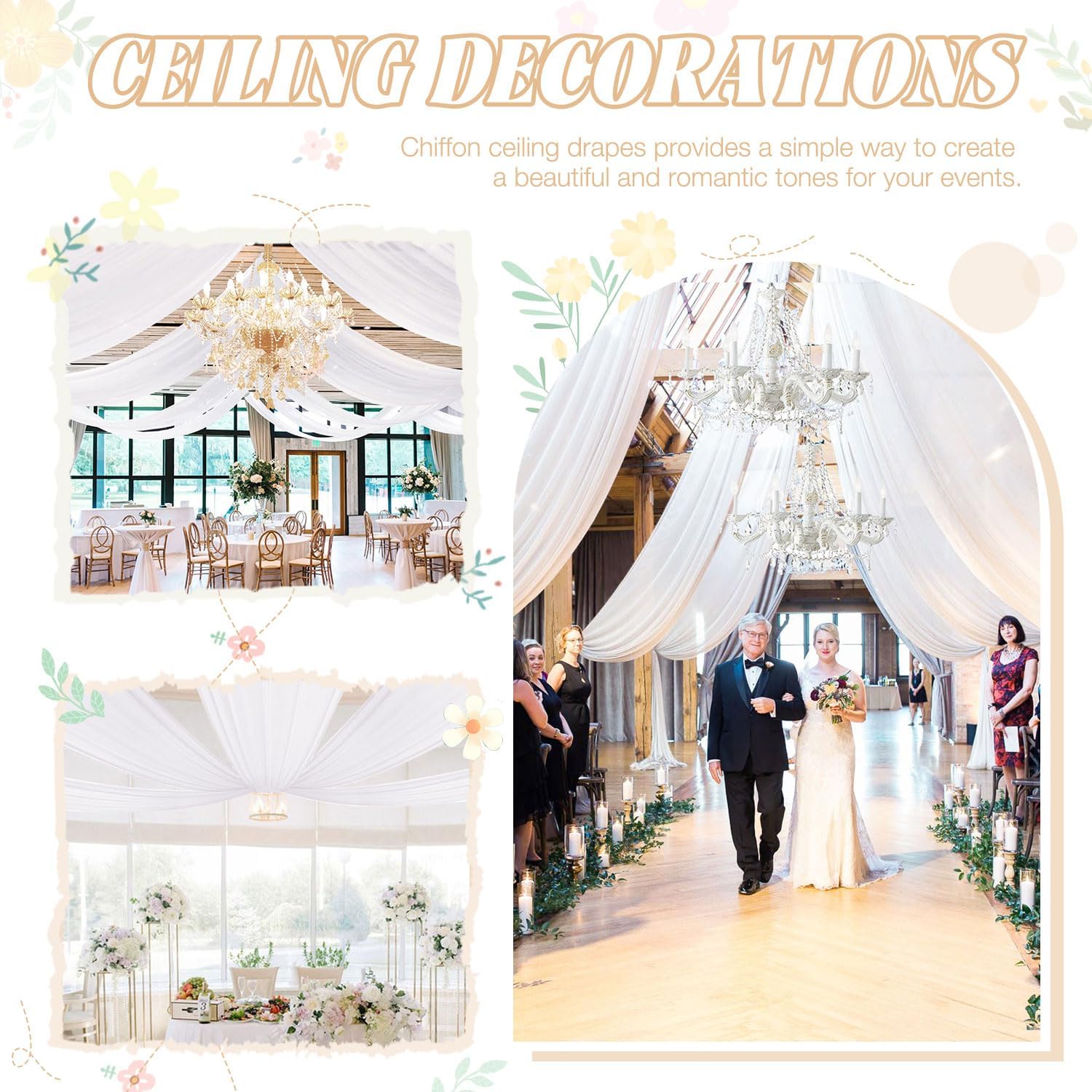• ✿【Size of Ceiling Drapes】Package includes 2 panels white chiffon fabric drapery. Size of each panel is 5FT( 60 inches) width by 20FT( 240 inches) length covering a total area of 10ft width x 20FT length. This chiffon drapery wedding ceiling backdrop can help your party to create a warm and elegant scenes.