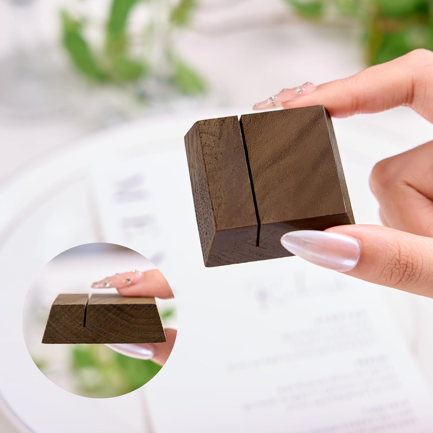 • Package Includes - A set of 12 Walnut Wood Stand Holders; Dimensions: 1.9 x 1.9 x 0.6 inches. Please note that all place cards and acrylic signs shown in the pictures are NOT included.