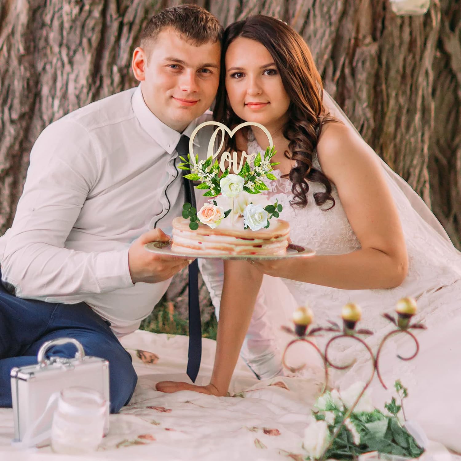 Juexica 6 Pcs Wedding Cake Topper Set Rustic Bridal Shower Heart Shaped Wedding Cake Topper Decorations Simulation Rose Flowers Leaves for Engagement Anniversary Party