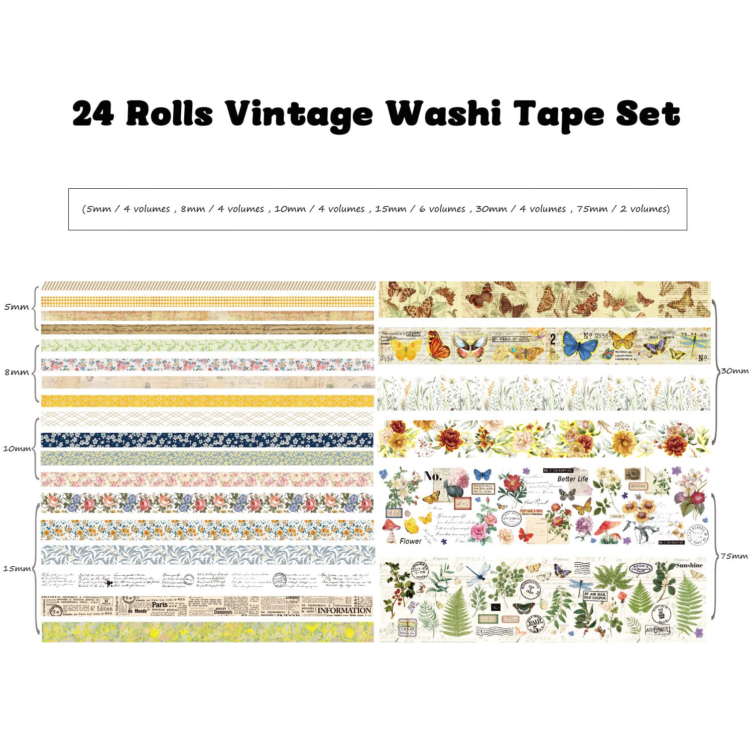 • 24 Rolls Washi Tape,2.95 inch(75mm) wide x 2 tapes;1.18 inch (30mm) wide x 4 tapes; 0.59 inch (15mm) wide x 6 tapes; 0.39 inch (10m) wide x 4 tapes;0.31 inch (8mm) wide x 4 tapes;0.19 inch (5mm) wide x 4 tapes;These different series and sufficient quantity washi paper stickers can meet your daily use and replacement.