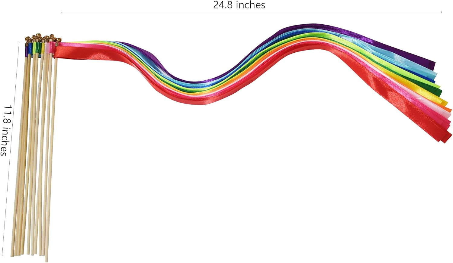 • 🌈All ribbon streamers are well crafted with smooth wooden stick handles, all ribbons and bells are securely attached to prevent them from slipping off when waved around. Ends of ribbons are heat sealed to prevent the ends from unraveling.