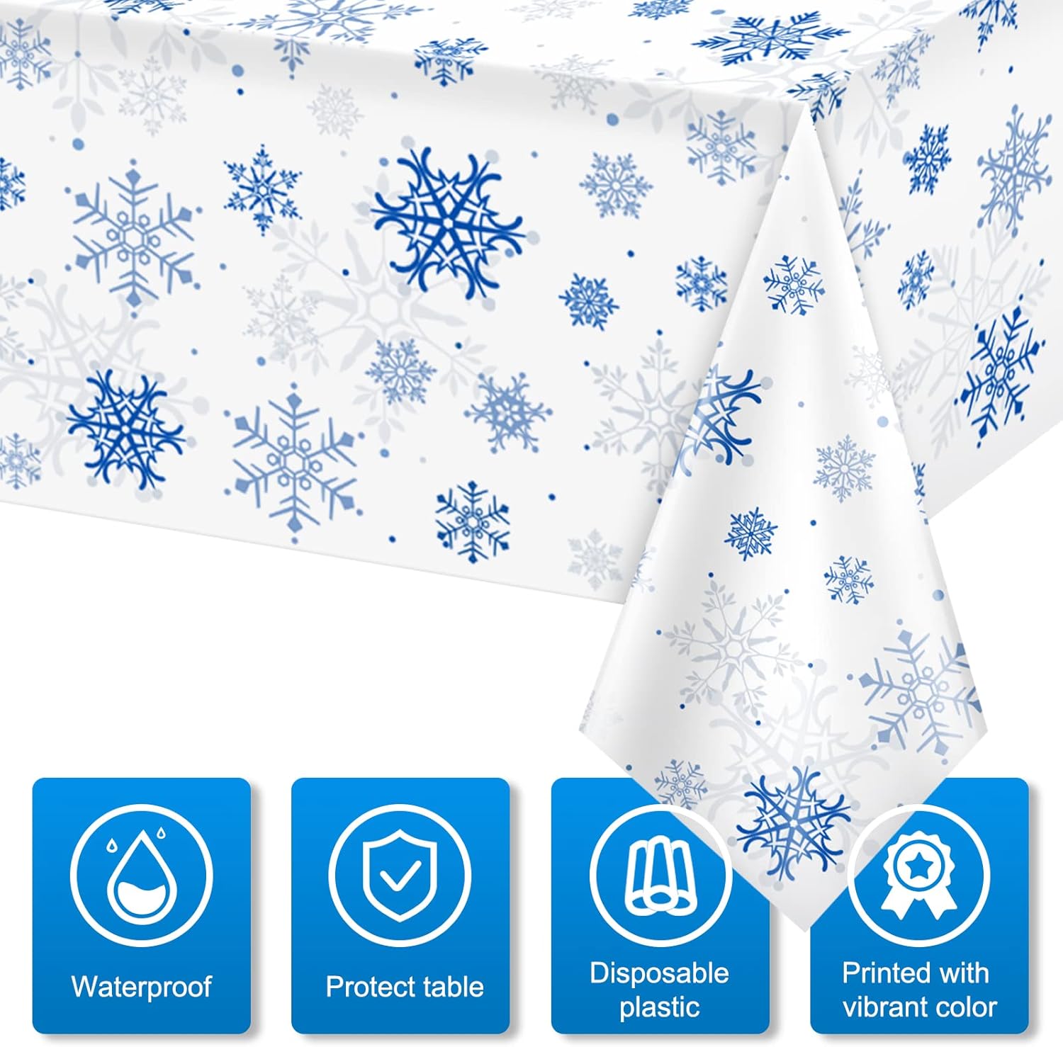 • What will you receive:8 pieces rectangular christmas party tablecloth,all over printed with ice blue snowflake patterns on white backdrop,ideal for decorating your winter holiday and Christmas party supplies and decorations