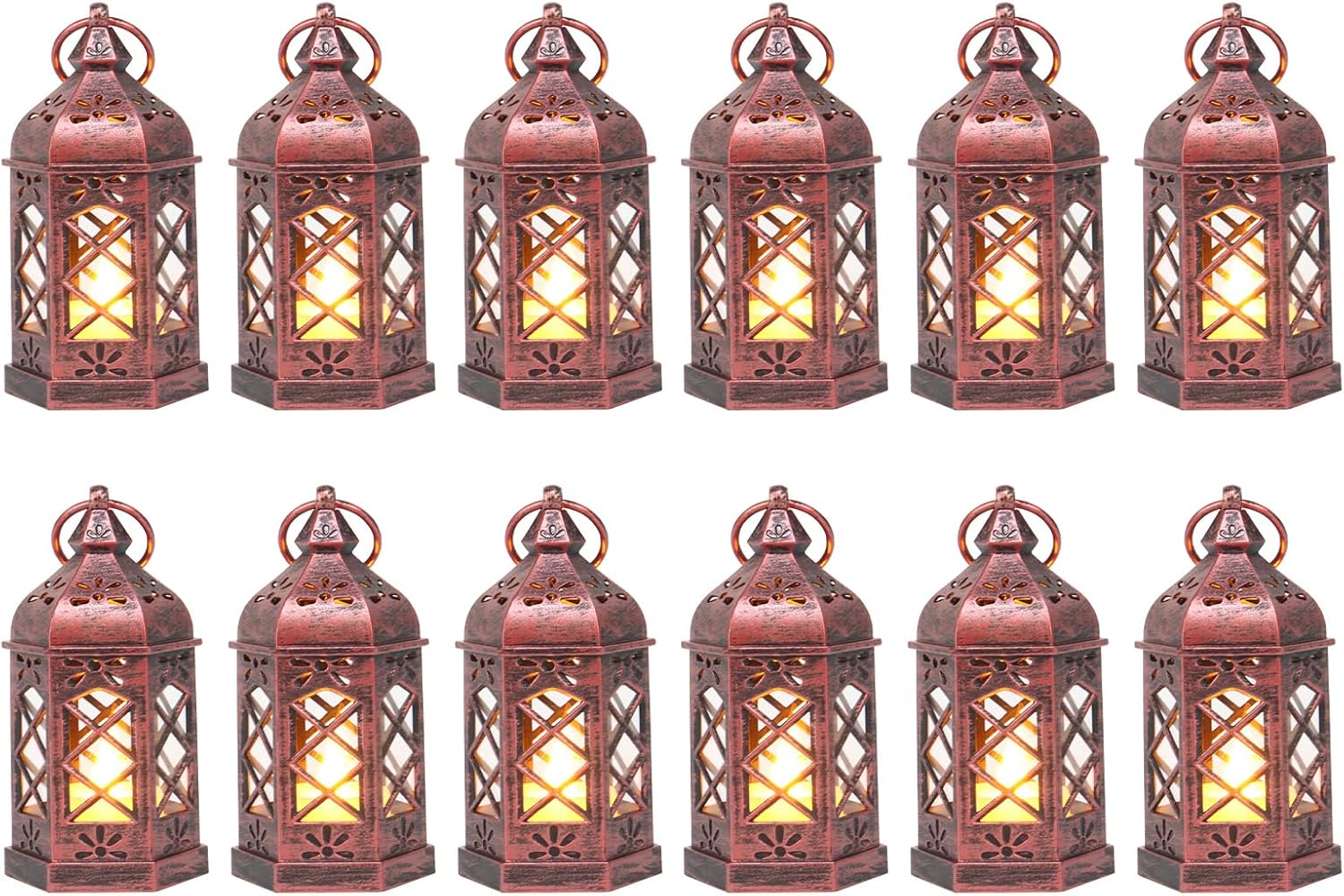 12PCS Mini Lantern with Flicker LED Candle for Halloween Decorations, Small Lanterns Decorative, Vintage Hanging Moroccan Lantern for Wedding Halloween Christmas Decor, Table Centerpiece, Rose Gold