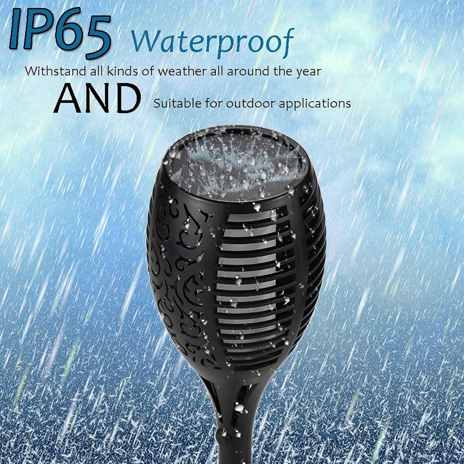 • AUTO ON/OFF: The solar torches lights work dusk to dawn. They can work 10-12 hours in summer and 5-8 hours in winter after fully charged. They are weatherproof and withstand all weather conditions, such as snow ,raining, thunder and lightning