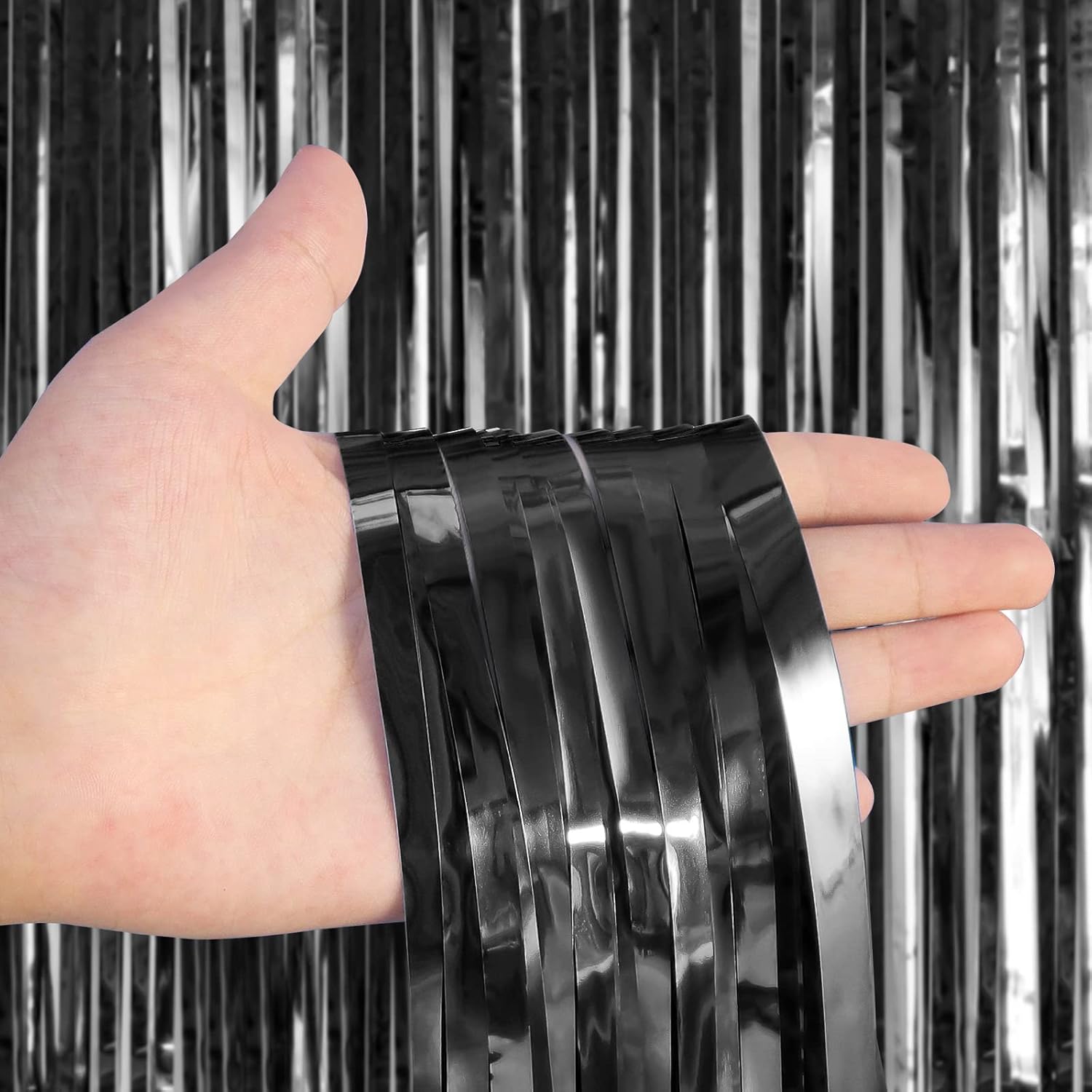 2 Pack Black Fringe Curtains Foil Shiny Fringe Backdrop Tinsel Door Streamers Foil Curtains for Birthday Wedding Engagement Bridal Shower Celebration Party Decorations Large