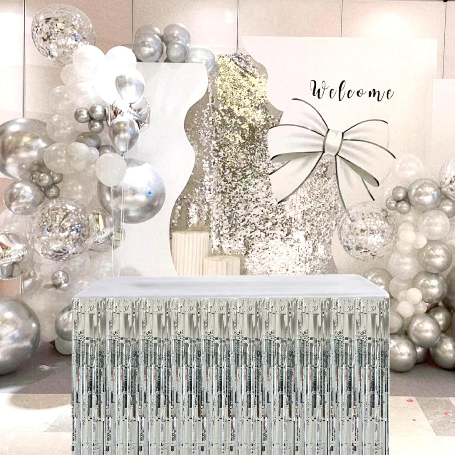 • 【RELIABLE SHINY FOIL TABLE SKIRT】Metallic tassel table skirt are made of aluminum foil with sequins, making the foil table skirt more shiny and beautiful, making the birthday party more complete! They can stay stuck on very well, with smooth surface, great for your silver birthday decoration.
