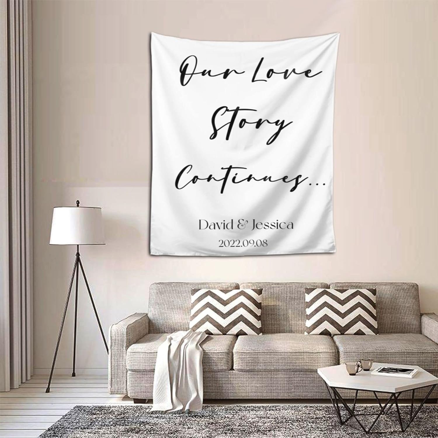 Our Love Story Continues Backdrop Custom Tapestry with Names and Date Personalized Calligraphy Banner for Ceremony Rustic Wedding Sign Reception Arch