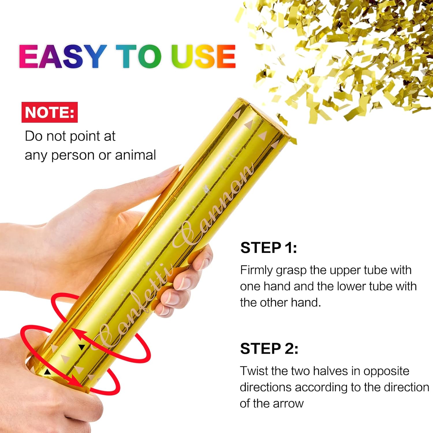 • BEFORE USE CONFETTI POPPERS - Please read the instructions and tear open the packaging paper at the bottom of the popper, then easy to twist it! In order to provide you with a better experience with confetti cannon and avoid being unable to twist.