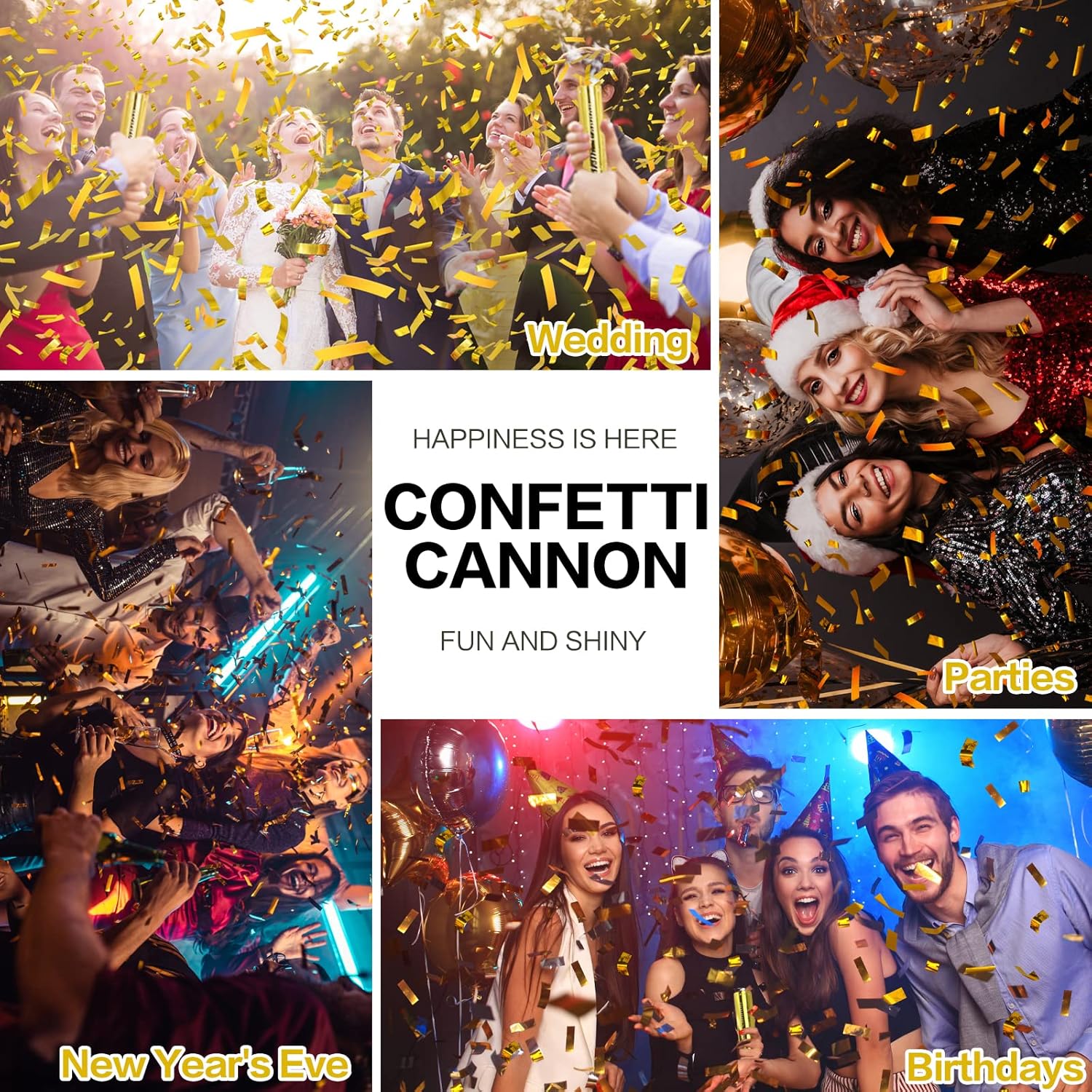 • Party Confetti Cannon for Any Events - A great way to add fun, festive energy to any party or gathering. These gold confetti poppers cannon are perfect for weddings, graduation,birthday party, Christmas, family reunions, or any event where you want to up the glam factor!