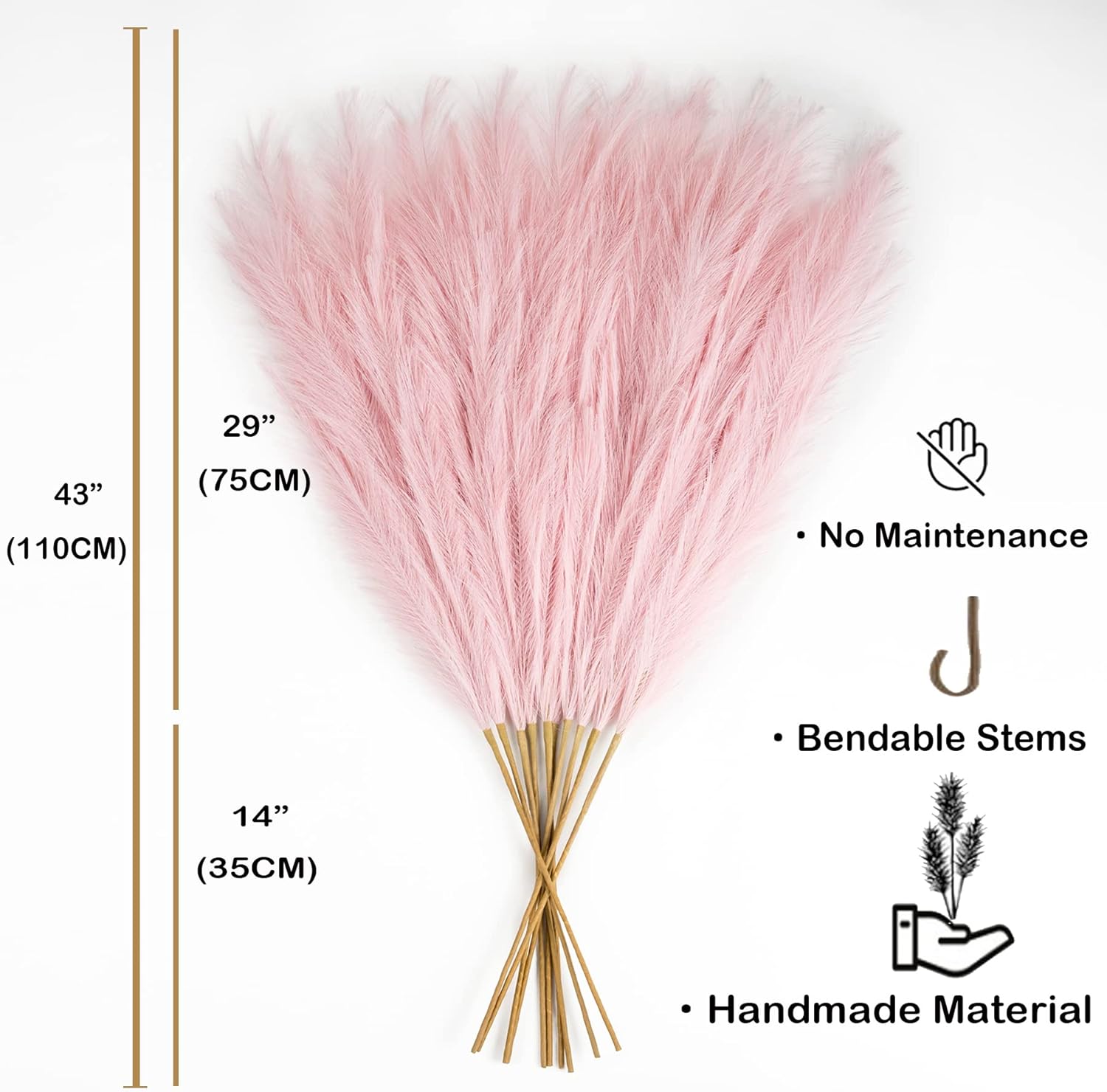 • High End Looking Faux Pampas Grass: It's actually made of a metal wire in the stem and silk feather, it holds shape very well. The pompass grass branches tall bulk is really soft and feather-like, with 15 branches on each stem, and the heads of each stem are designed so you can fluff them up for a fuller look