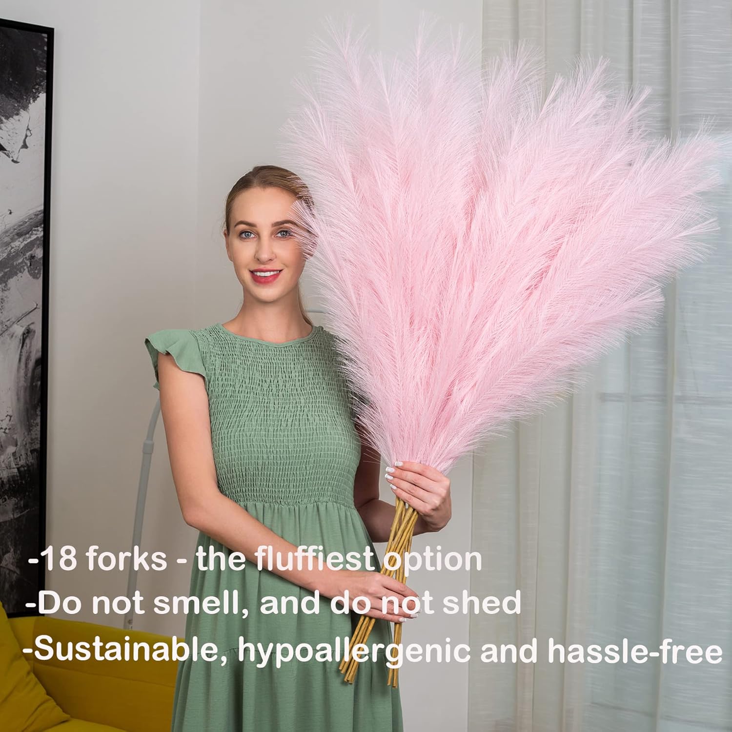• Great Alternative for Real Pampas: Unlike dried pampas grass, our pompous grass does not shed like the real version, the long fibers on each stick are tied so strongly that they do not fall off. No allergens, no smell, without the maintenance cleaning and will last a long time