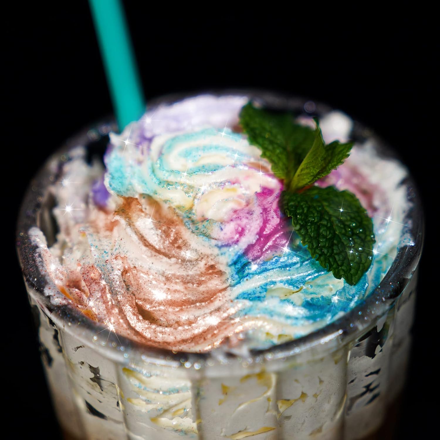 • ✔️【Use with Brews】Food-grade glitters are so fun and simple to use with brews. Add one pinch or two directly to your favorite beverage, mix it with cocktail syrups, juices, liqueurs, liquors, or spirits. Use a clear glass instead of opaque containers so that the liquid looks so cool, especially when you move it around in the glass with a stir. A tiny amount of dust can create a great visual spectacle, and clear liquids offer a great blank canvas for glitter to show off the best ability.