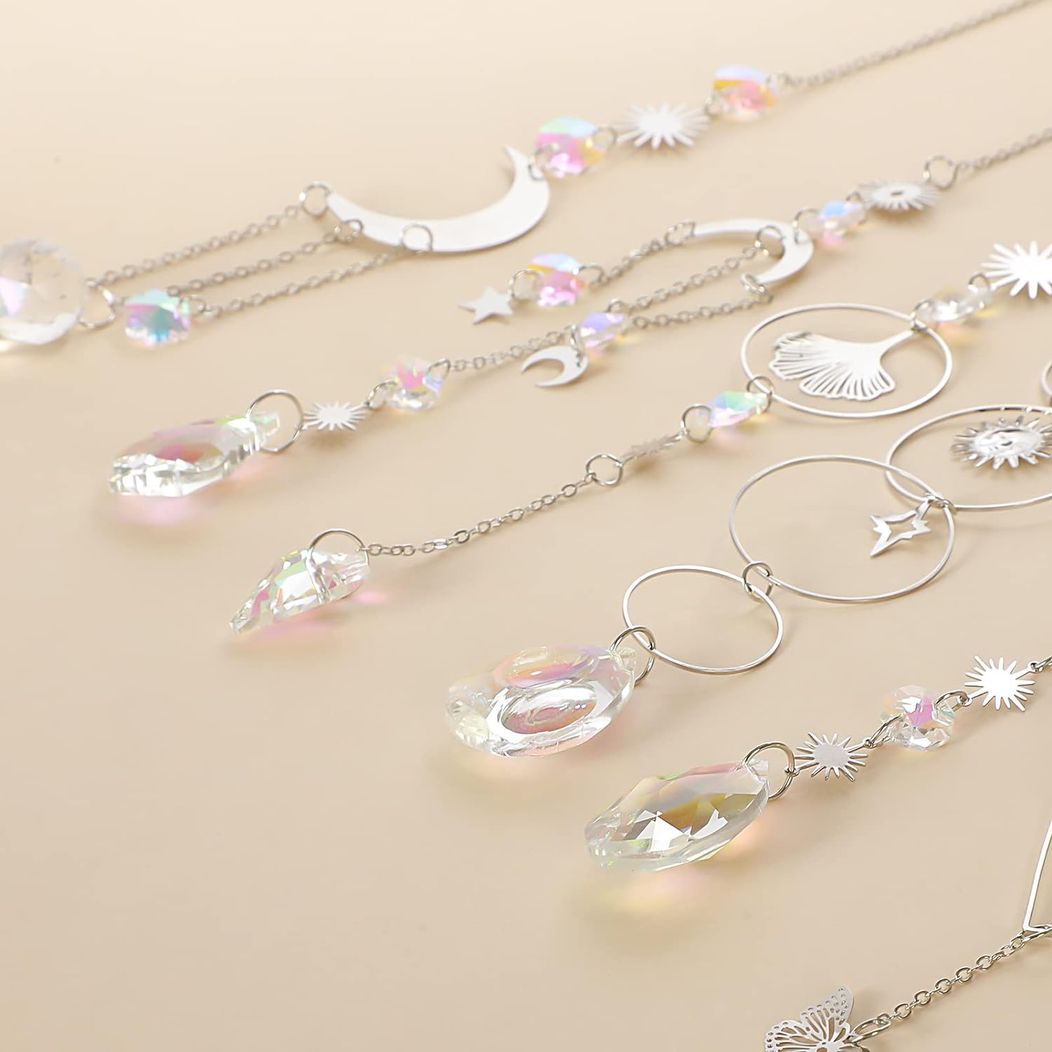 • Sun Catchers Specification: These 6 pieces colorful long chain suncatchers is made out by moon sun metal form frame and clear crystal balls, drops string. Ours are unique designs for decoration. With sun the prism crystal reflectiing, rainbows all around the room