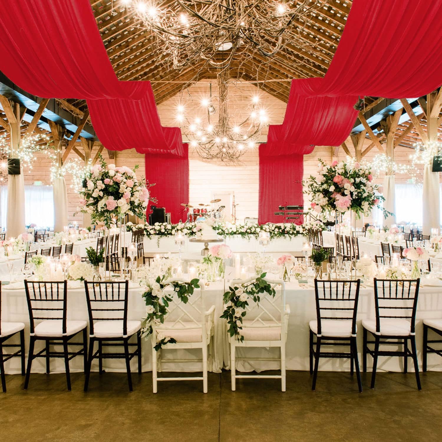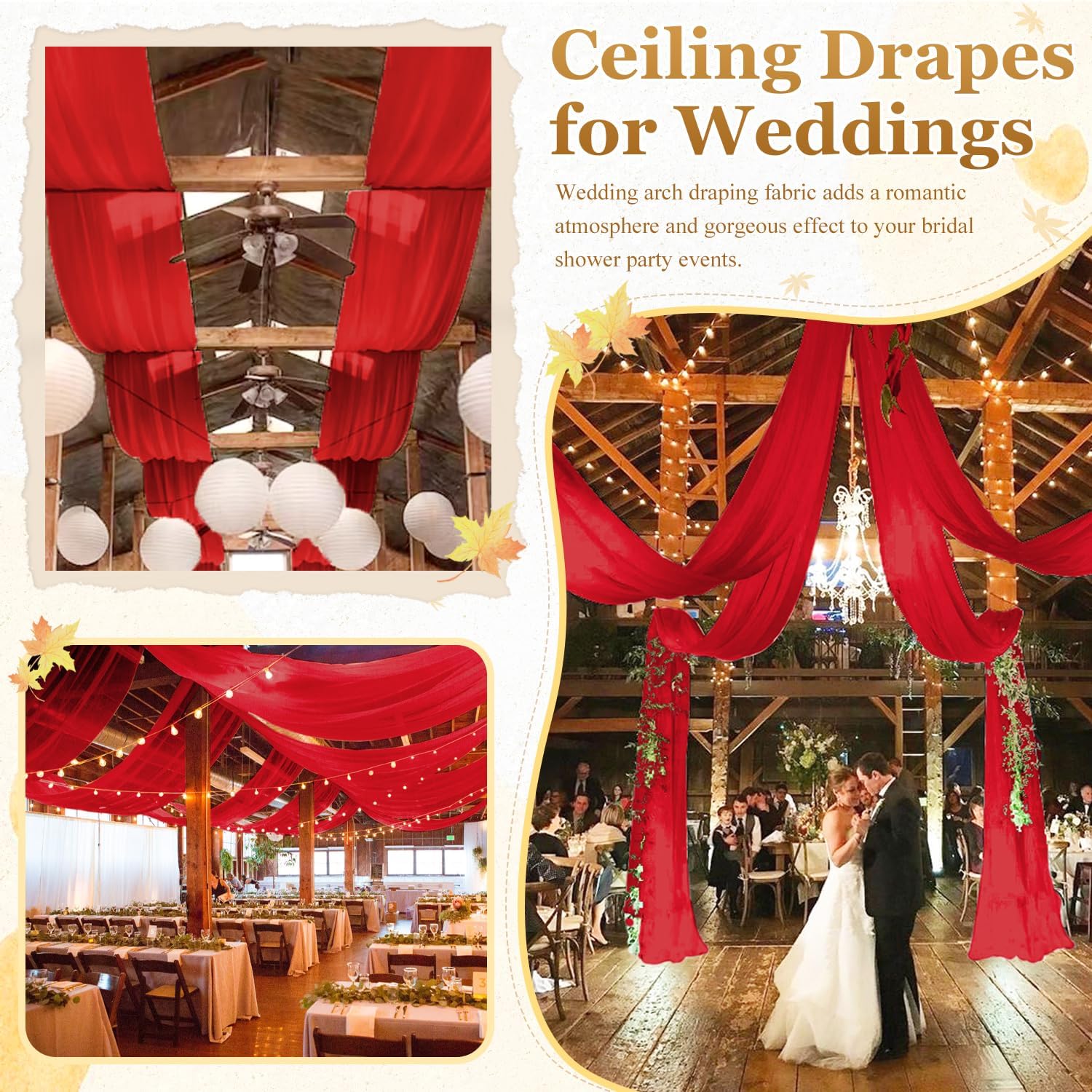 • ⭐Quality Material - Ceiling Drapery for Wedding: The material of wedding arch draoes fabric is premium sheer chiffon fabric, silky soft and wrinkle-free, sturdy and reusable. More graceful than other nylon fabrics. All edges of red ceiling panels are finished with with nice stitching. The wedding arch drapery is a good choice for party decoations, giving your events an elegant and romantic look.