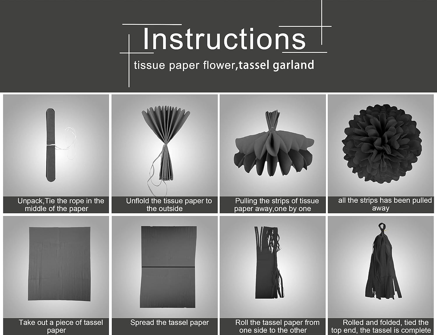• 【Package Contains】The decoration kit include 6pcs tissue paper pom poms,15pcs tissue paper tassle garland,1pcs flag banner,1pcs party streamers.all come in 3 color of silver black and Silver.