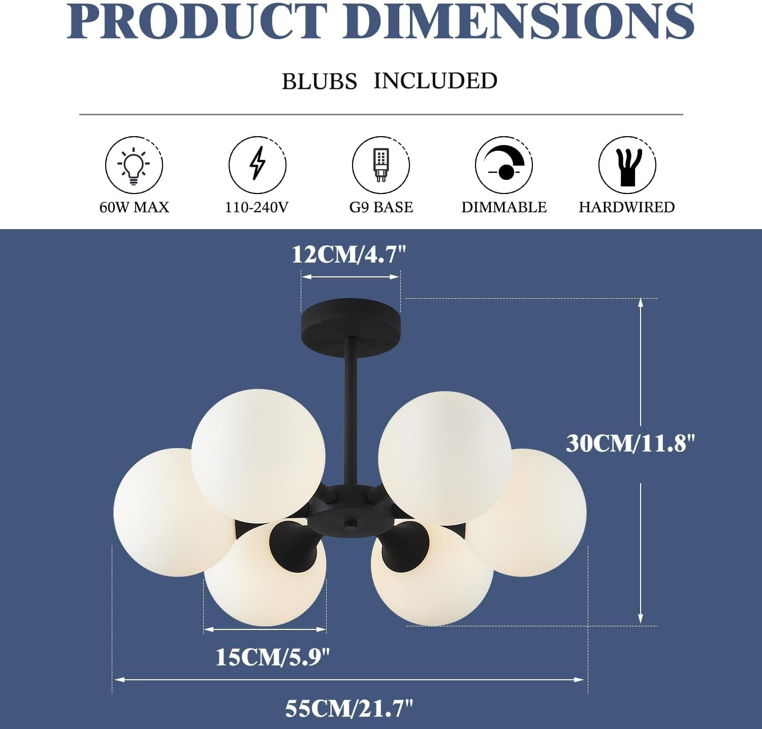 • G9 Base: This black metal semi flush mount ceiling light is compatible with G9 socket bulbs, whether they are energy efficient LED bulbs or vintage incandescent bulbs, they can be easily adapted. The ceiling light fixture 6 lights itself is not dimmable, but it can be fully dimmable when used with dimmable bulbs and a compatible dimmable switch. You can choose different color temperature and brightness bulbs according to different occasions to customize your lighting environment (Bulbs and dimmable switch not included)