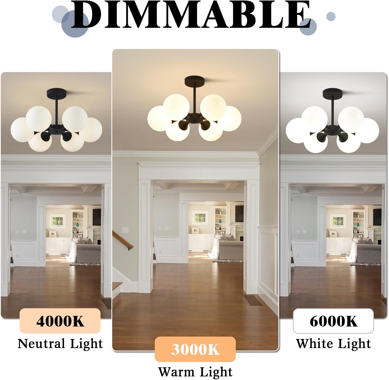 • Black and White Color Scheme: This globe flush mount ceiling light stands out with its minimalist yet stylish design. The smooth black metal lamp body shows the hard texture of industrial style; with 6 rounded frosted white glass globe shades, it is soft and cozy, injecting the artistic atmosphere into the space. Whether it is a modern and simple living room or a warm and comfortable dining room, it can be perfectly adapted to become the visual focus of the space