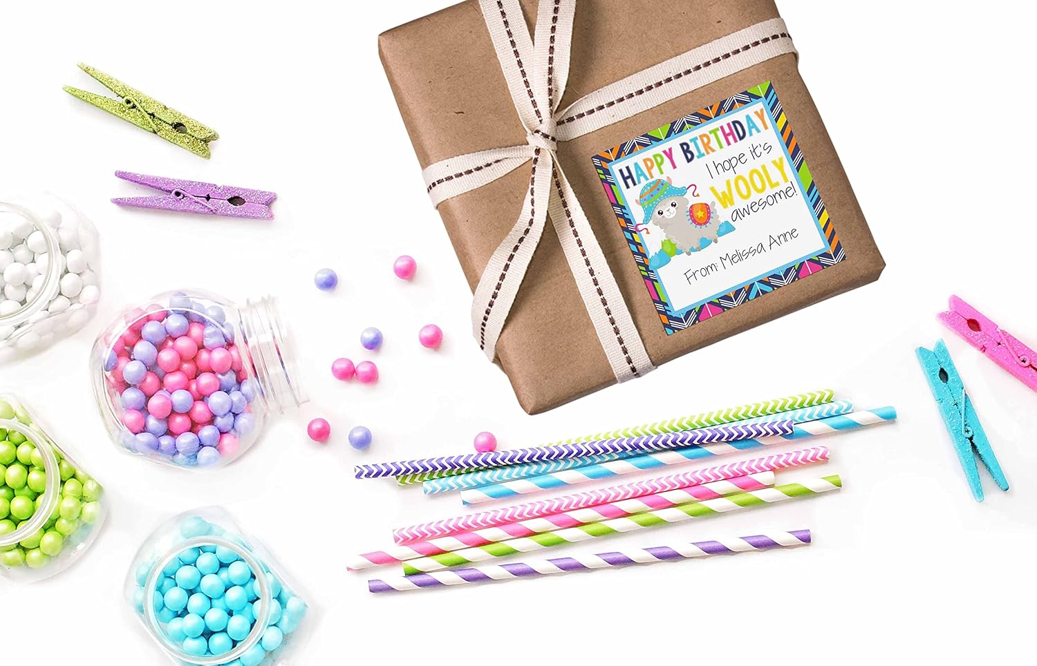• Cuteness Overload: Designed by a talented mom, these colorful stickers feature an adorable alpaca theme. The clever message of "wooly awesome" birthday wishes is the perfect way to honor the birthday boy or girl. Each sticker will be custom printed and personalized just for you! Amanda Creation. Original design by Amanda Creation.