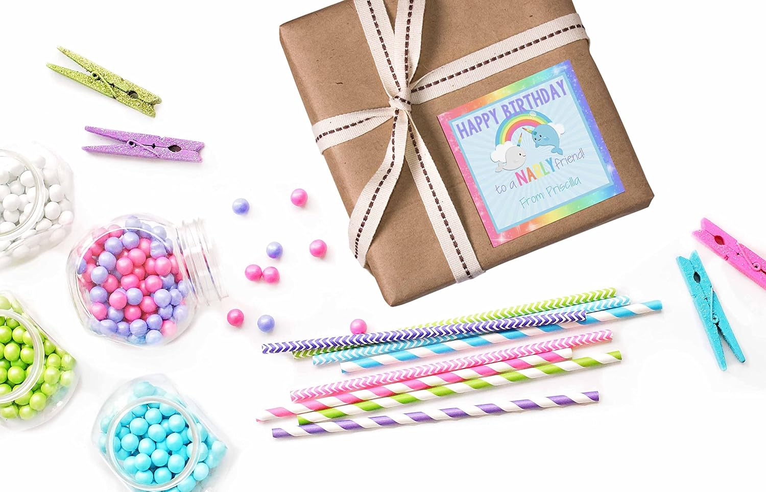 • Cuteness Overload: Designed by a talented mom, these cute stickers feature an adorable birthday narwhal design. The clever message of "NARLY" birthday wishes is the perfect way to honor the birthday boy or girl. Each sticker will be custom printed and personalized just for you! Amanda Creation. Original design by Amanda Creation.