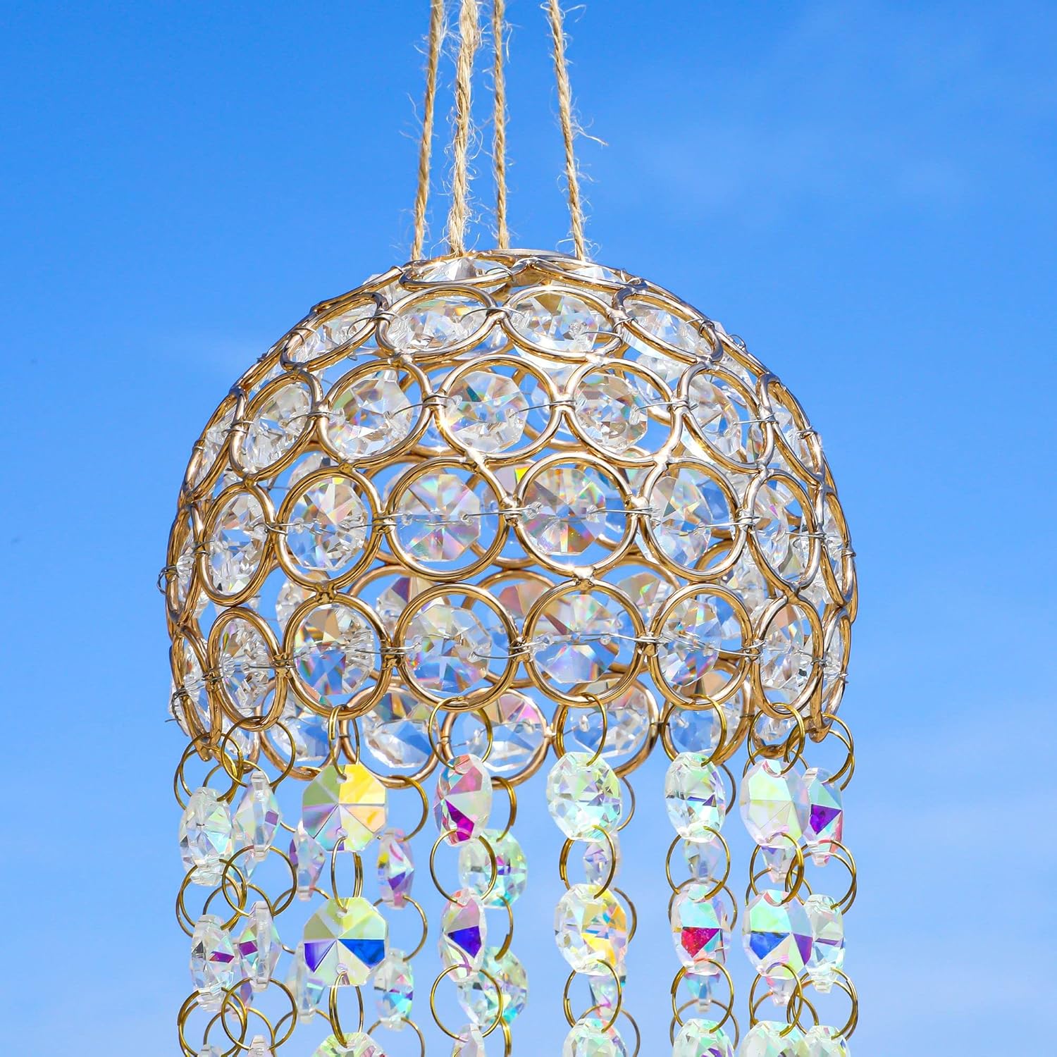 • Make-up - This crystal chandelier wind chime is made by high quality K9 grade ab color coating crystal glass suncatcher prisms and beads, gold plated sun/moon/leaf charm and metal suncatcher frame,hanging hemp rope and metal hook