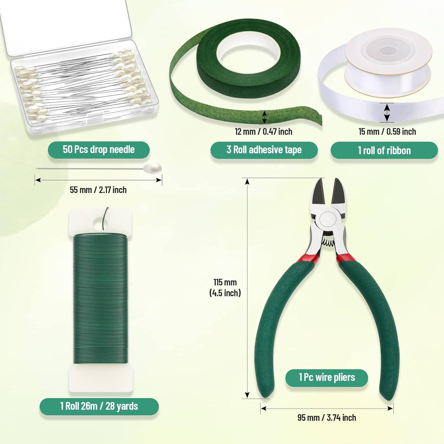• FLORAL TAPE AND WIRE ARRANGEMENT KIT INCLUDED – 114 feet green paddle wire 22 gauge, 3 rolls dark green floral tape, 50pcs corsage boutonniere pins, 1 roll of 5/8" wide satin white ribbon and 1 pair wire cutter. These bouquets making supplies are all you need for DIY flower arrangements, bouquets, and boutonnieres etc.