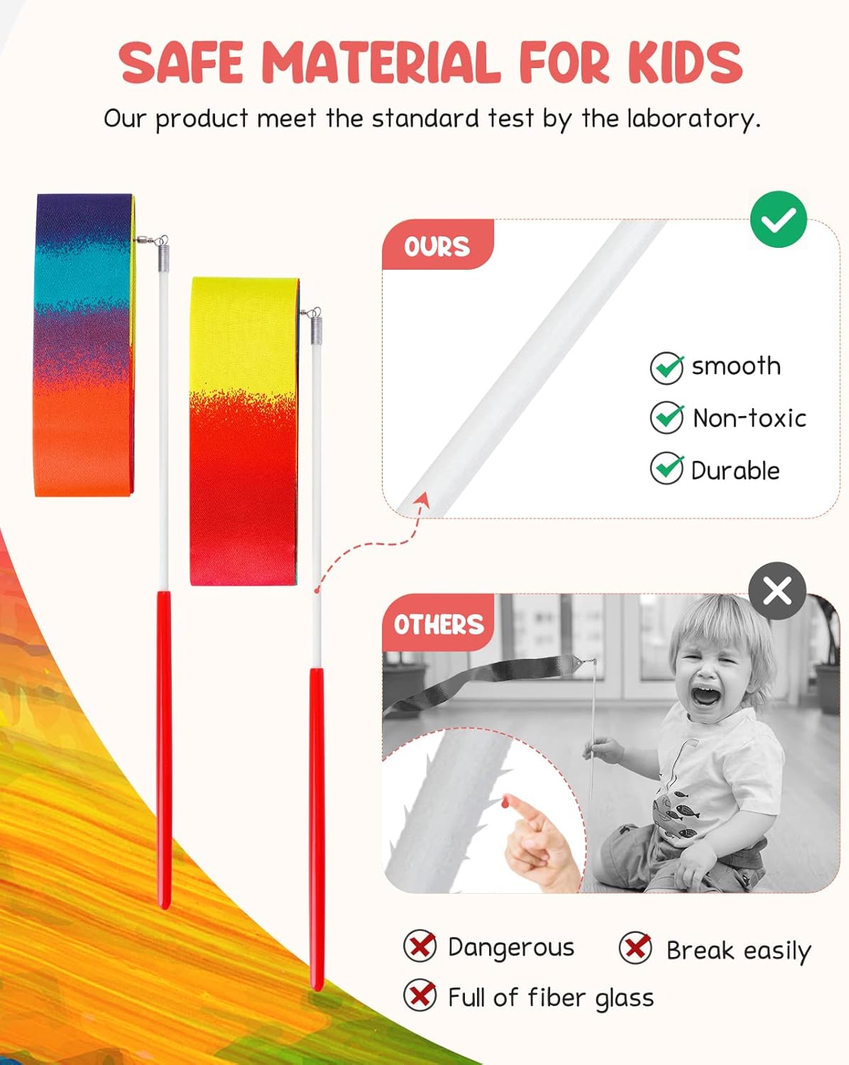 • Upgraded Material:Meet the standard test by the laboratory,the Joycat dance ribbon streamers can be used by kids without worry.The gymnastics ribbon is made of high-quality silk and red plastic coating handle,which is smooth,non-toxic and high quality