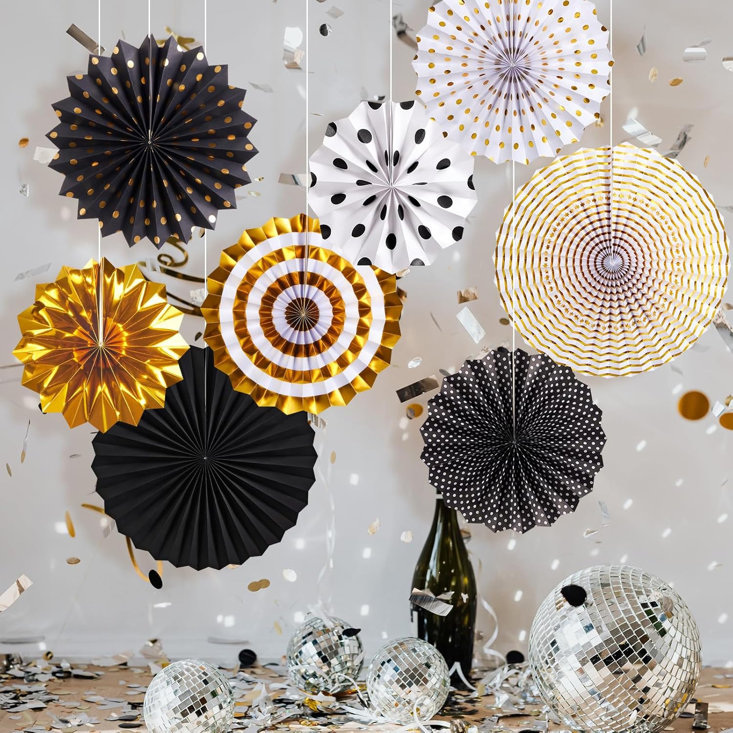 • 8 black gold decoration set: you will receive 8 different sizes of hanging paper fans, including 2 x 15.7 inch paper fans, 4 x 11.8 inch paper fans, 2 x 7.8 inch paper fans.