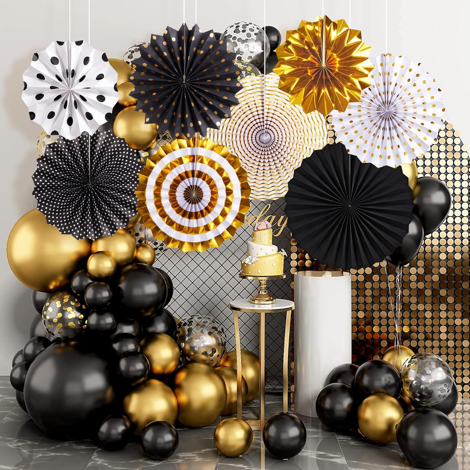 SUNBEAUTY Gold Black Paper Fans Backdrop for Tea Party Weddding Spring Birthday Classroom Baby Shower Halloween Decoration Hanging Home Party - 8Pcs