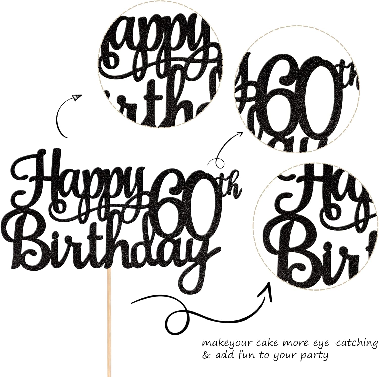1 PCS Happy 60th Birthday Cake Topper Glitter Cheers to 60 Years Birthday Cake Pick 60 Fabulous Cake Decoration for Happy 60th Birthday Anniversary Party Decorations Supplies Black