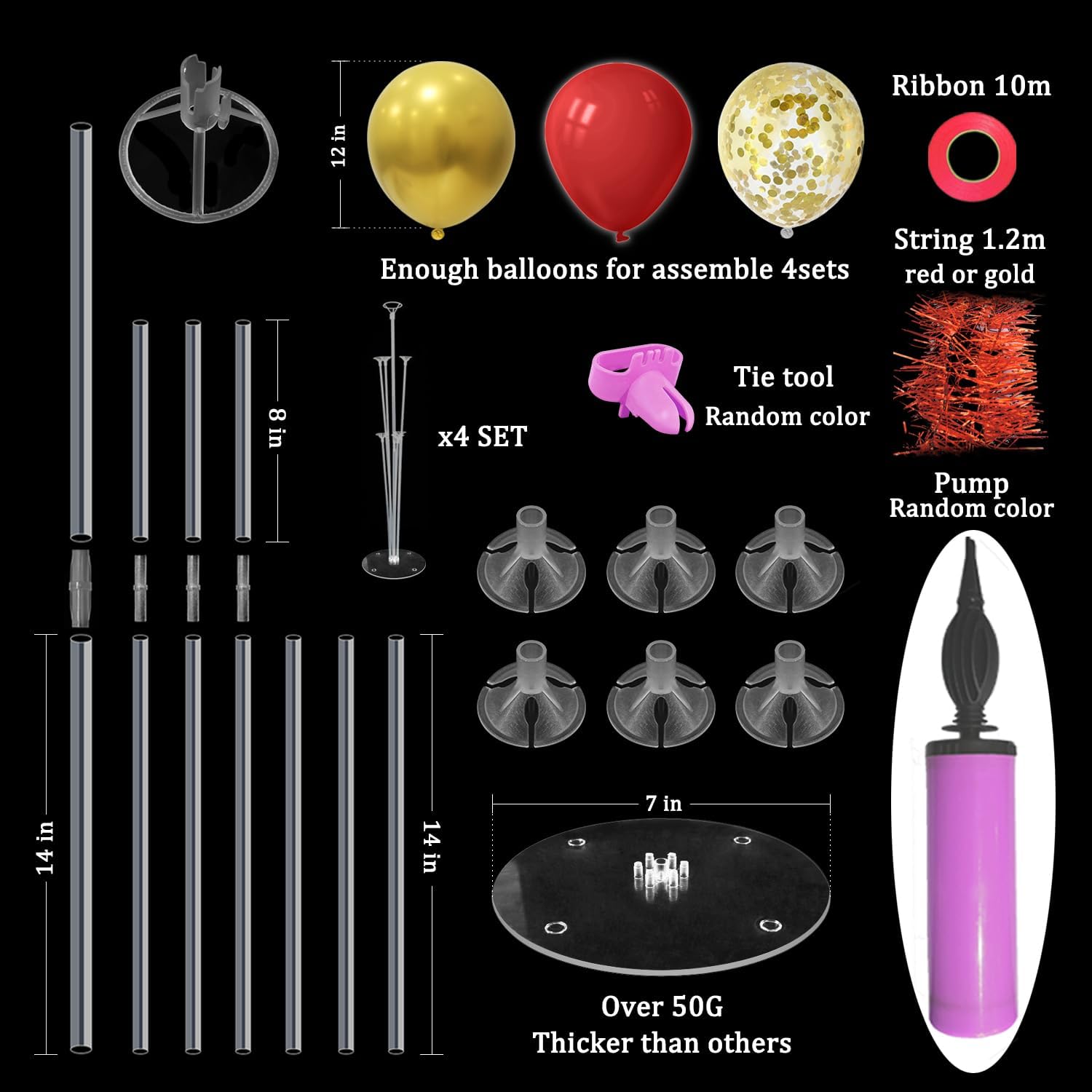 • WHAT INLCUDE: This balloon stand kit include 4 set balloon holders, 35 pcs balloons - red and gold balloons, gold confetti balloons, balloon pump, ribbons, glue dots and tie tool